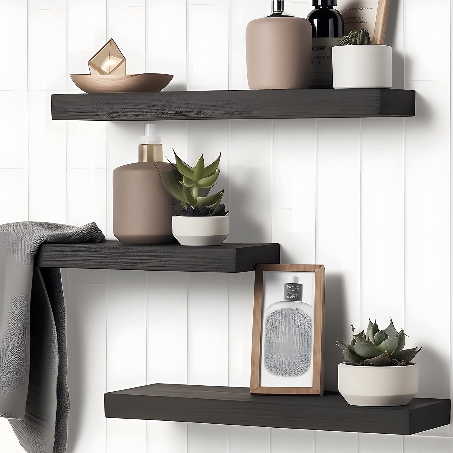 - BEAUTIFUL GRAIN FLOATING SHELVES Rustic look, stereoscopic wood grain, farmhouse floating shelves coordinates perfectly with your home decor, it brings a whole new life to your bathroom, bedroom, office or kitchen, you will receive tons of compliments on it!