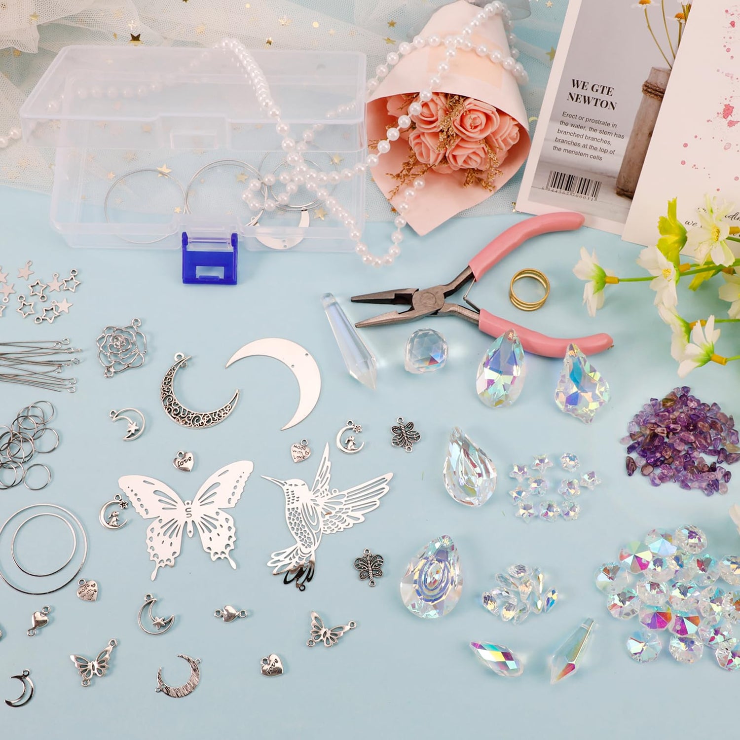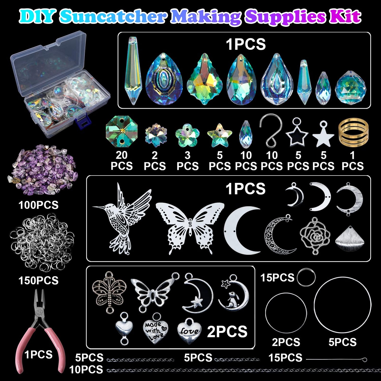 - Arts And Crafts for Adults: This sun catchers making supplies kit contains assorted crystal beads, crystal pendants, purple crystals, metal butterfly hummingbird rose , with a variety of moon, stars and heart metal decor, and tools. Everything you need in one box, is a great craft kits for adults.