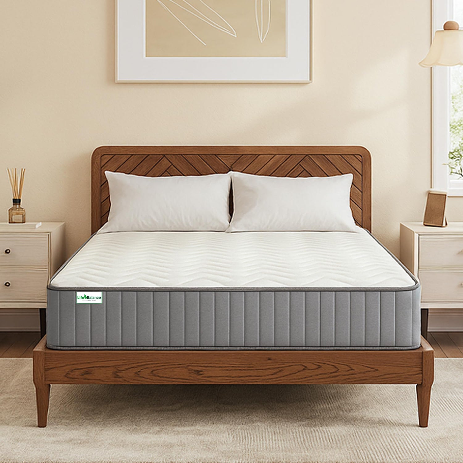 - Balanced Comfort for Every Sleeping Position: The Life Balance mattress offers a medium feel that adapts to your body, providing optimal comfort and support in every sleeping position—whether you’re on your back, side, or stomach. Its hybrid design combines premium pocketed coils with supportive foam, delivering the perfect balance of plush comfort and sturdy support. This versatile mattress is suitable for all types of bed frames, including adjustable bed frames. Available in four standard U.S. sizes and thickness options of 10” and 12”, this king hybrid mattress is crafted to meet the needs of all types of sleepers.