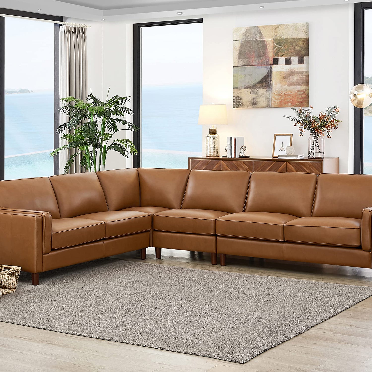 Hydeline Bella Top Grain Leather Sectional (L-Shape, Cognac), Feather Down, Memory Foam and Springs Seating