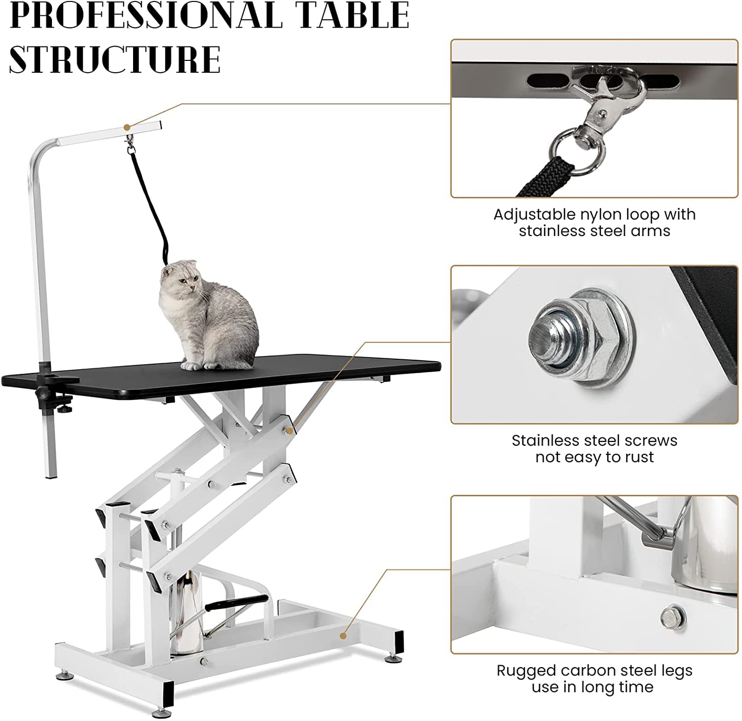 - 【Z-shaped Hydraulic System】With a Z-lift base, the dog grooming table can provide extra stability and eliminates wobbling and tipping. You can raise the height of the dogs so that you can reach them easily for bathing, trimming, drying, grooming, or other pet care.