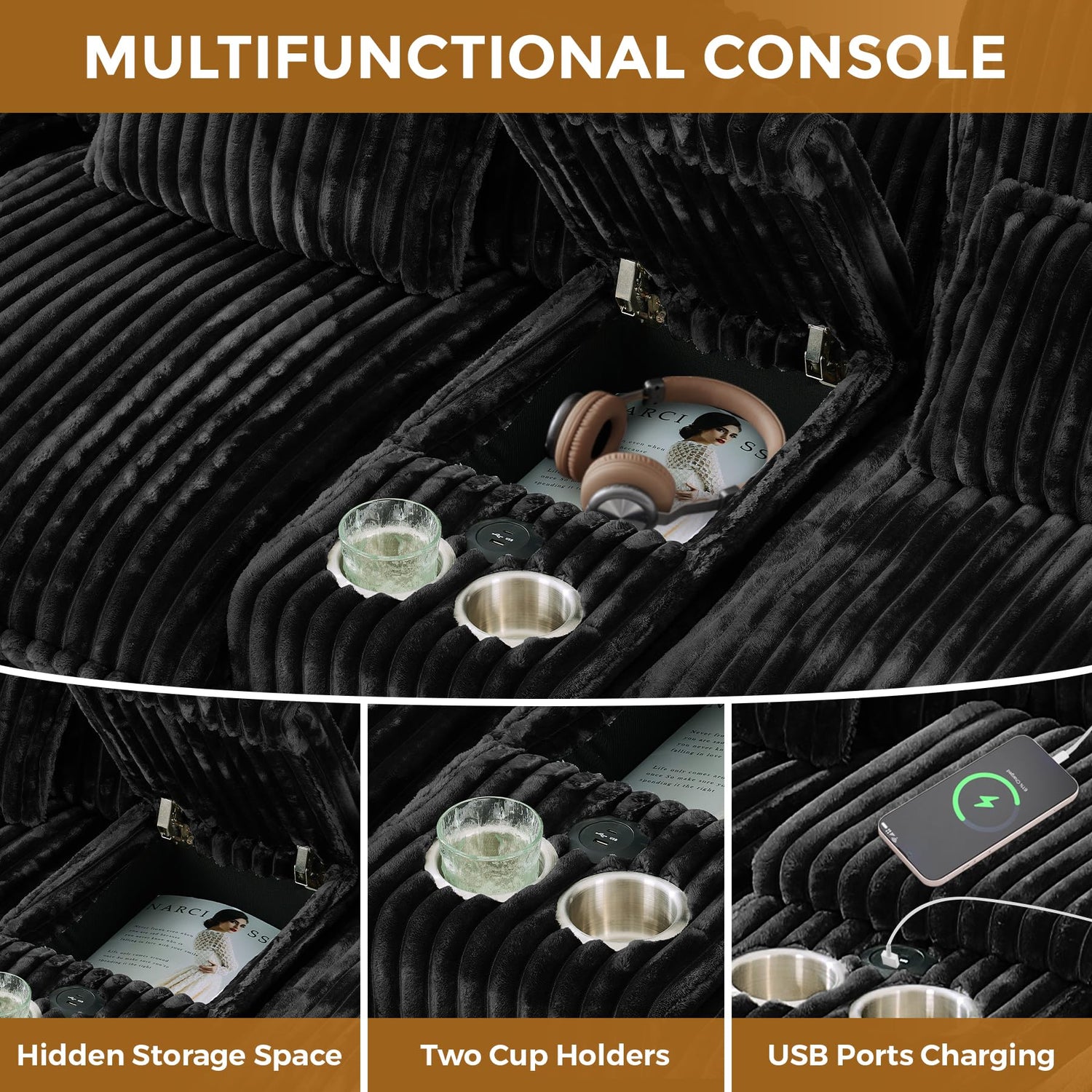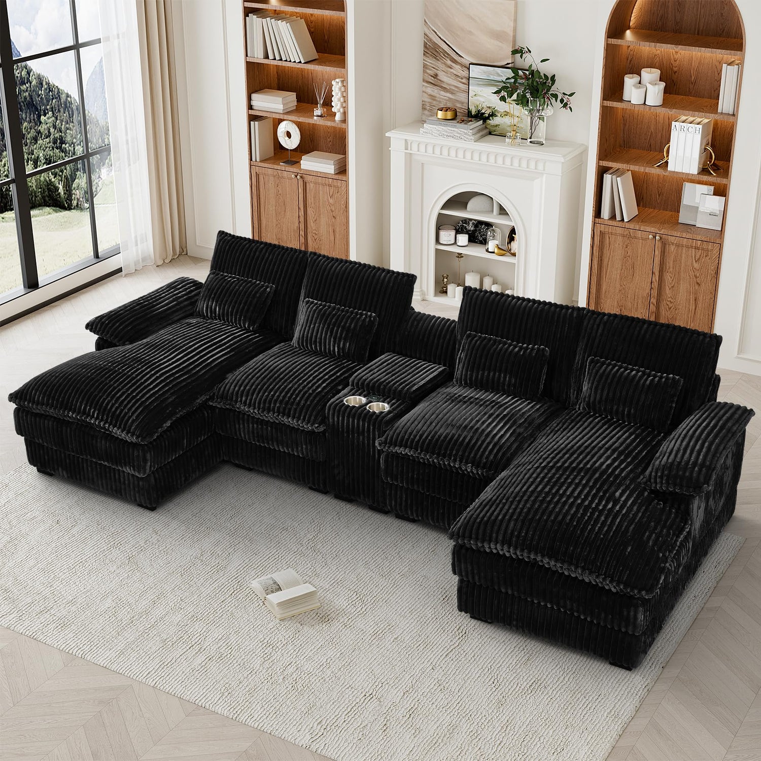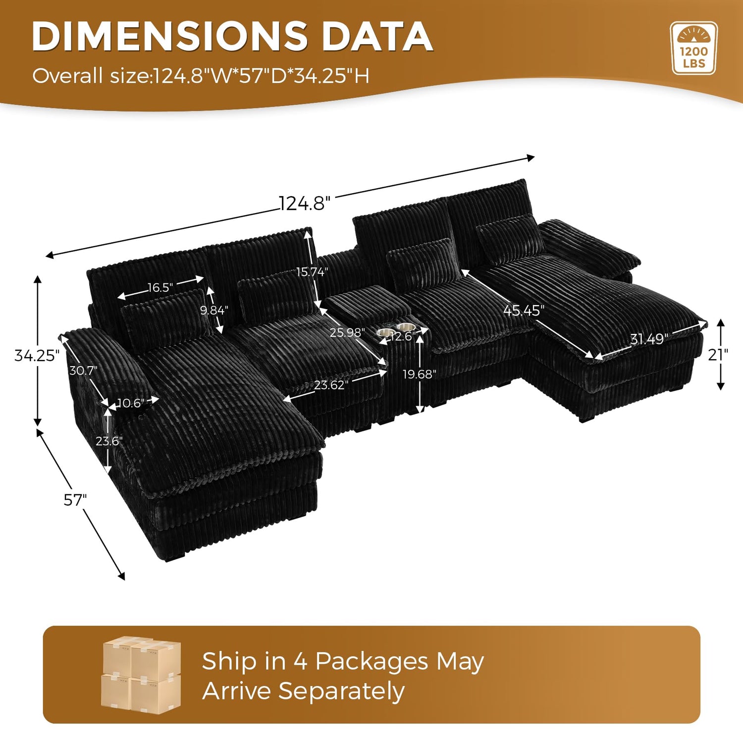 HYJT-H&K 124" U Shaped Cloud Couch Sectional, Comfy Fluffy Plush Corduroy Black Sectional Couches for Living Room, Modern Modular Corduroy Couch Sectionals with Central Console & Double Chaise Lounge