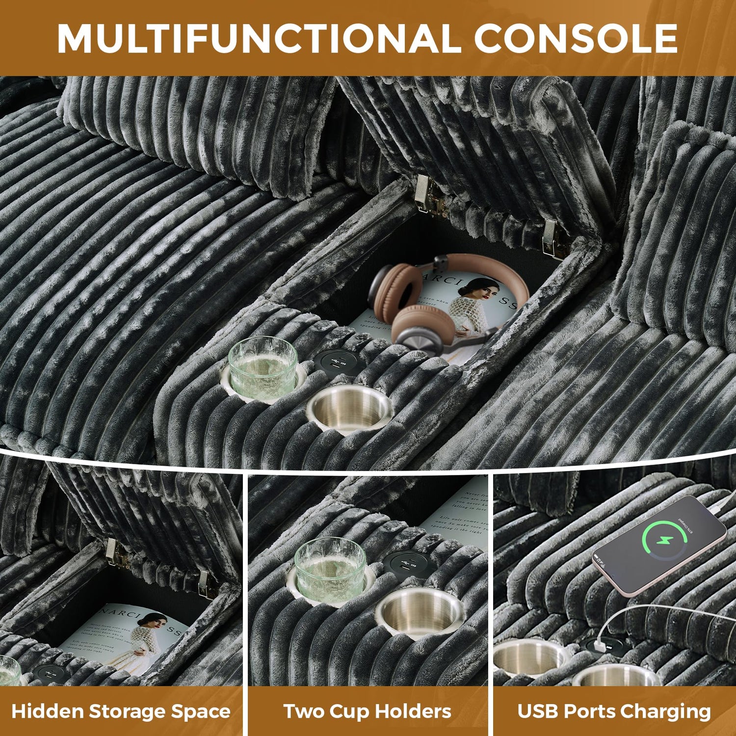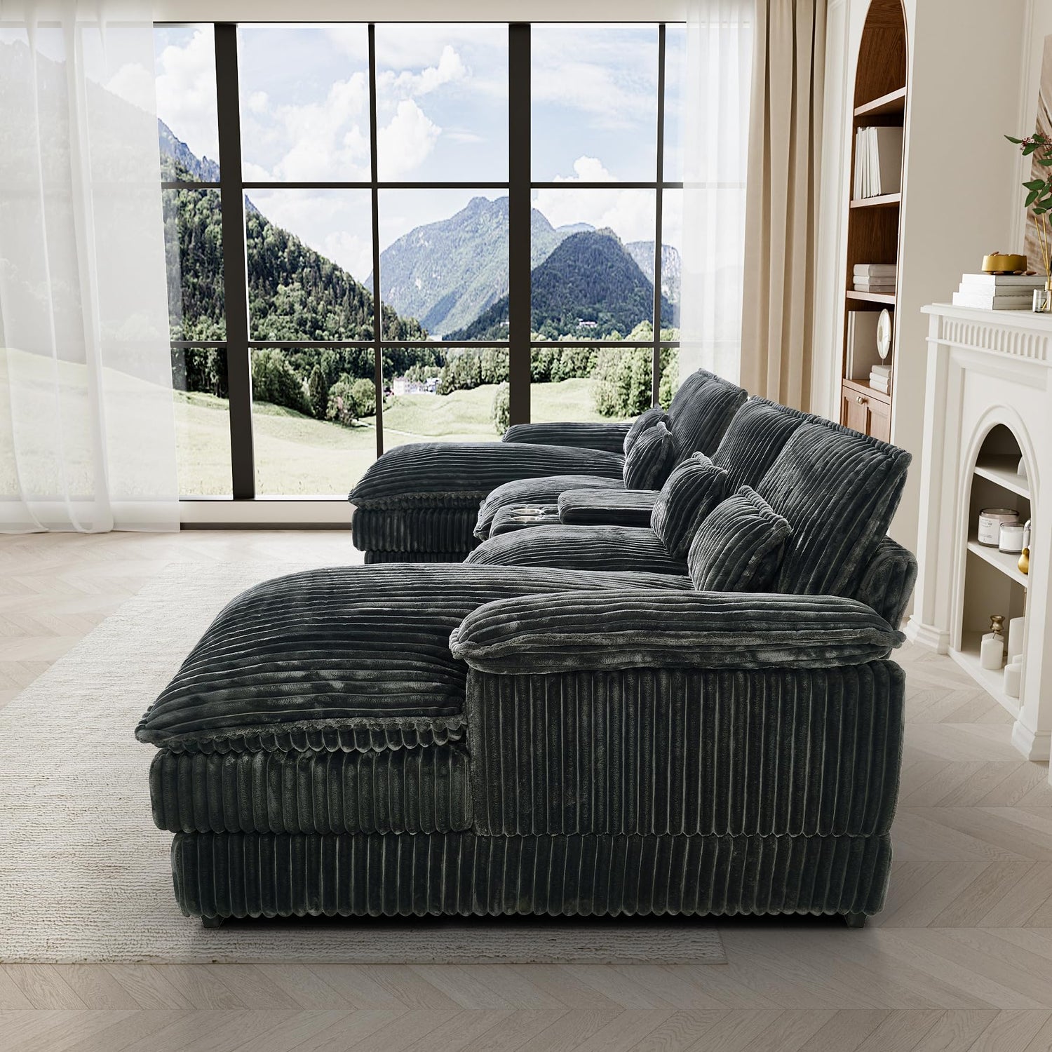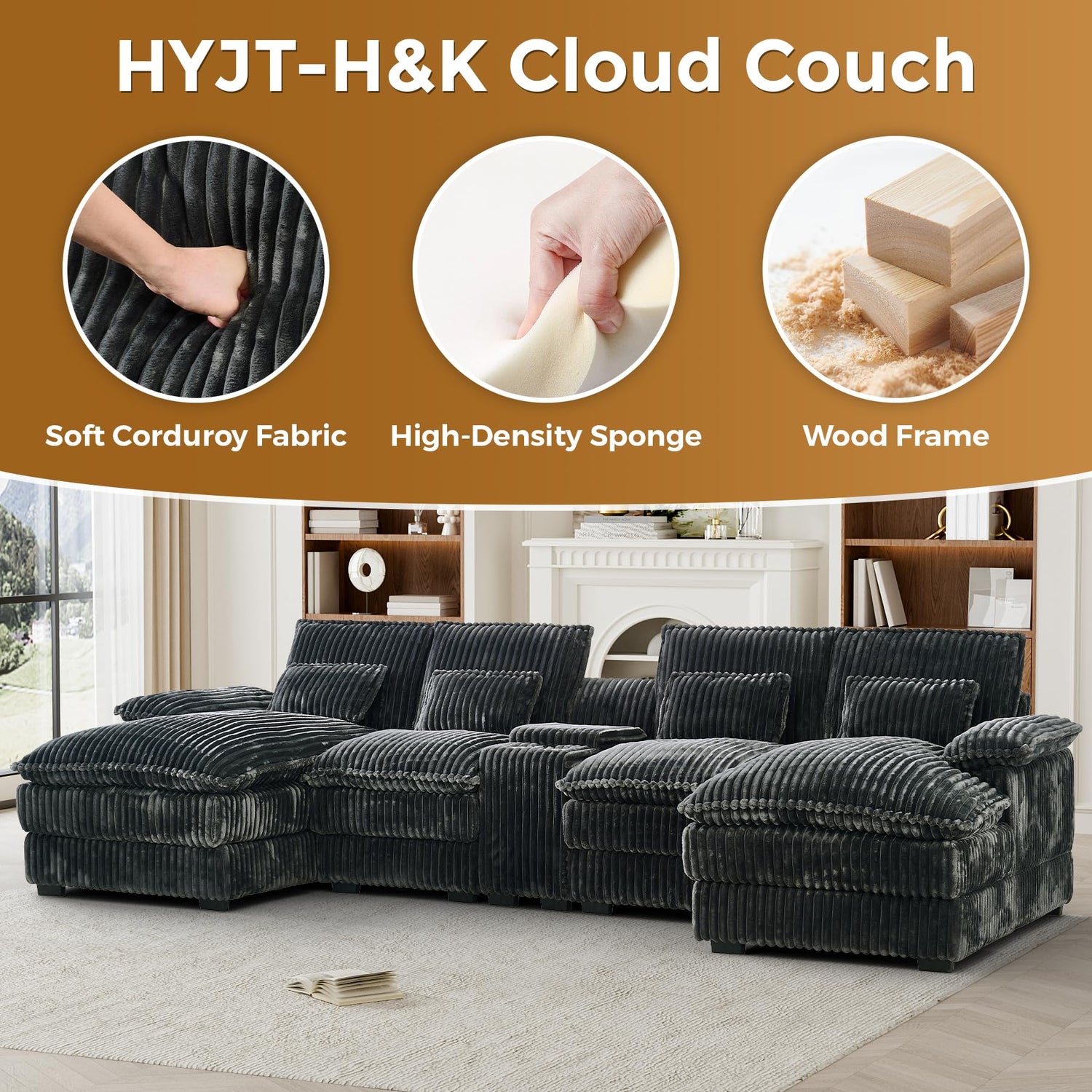 HYJT-H&K 124" U Shaped Cloud Couch Sectional, Comfy Fluffy Plush Corduroy Grey Sectional Couches for Living Room, Modern Modular Corduroy Couch Sectionals with Central Console & Double Chaise Lounge