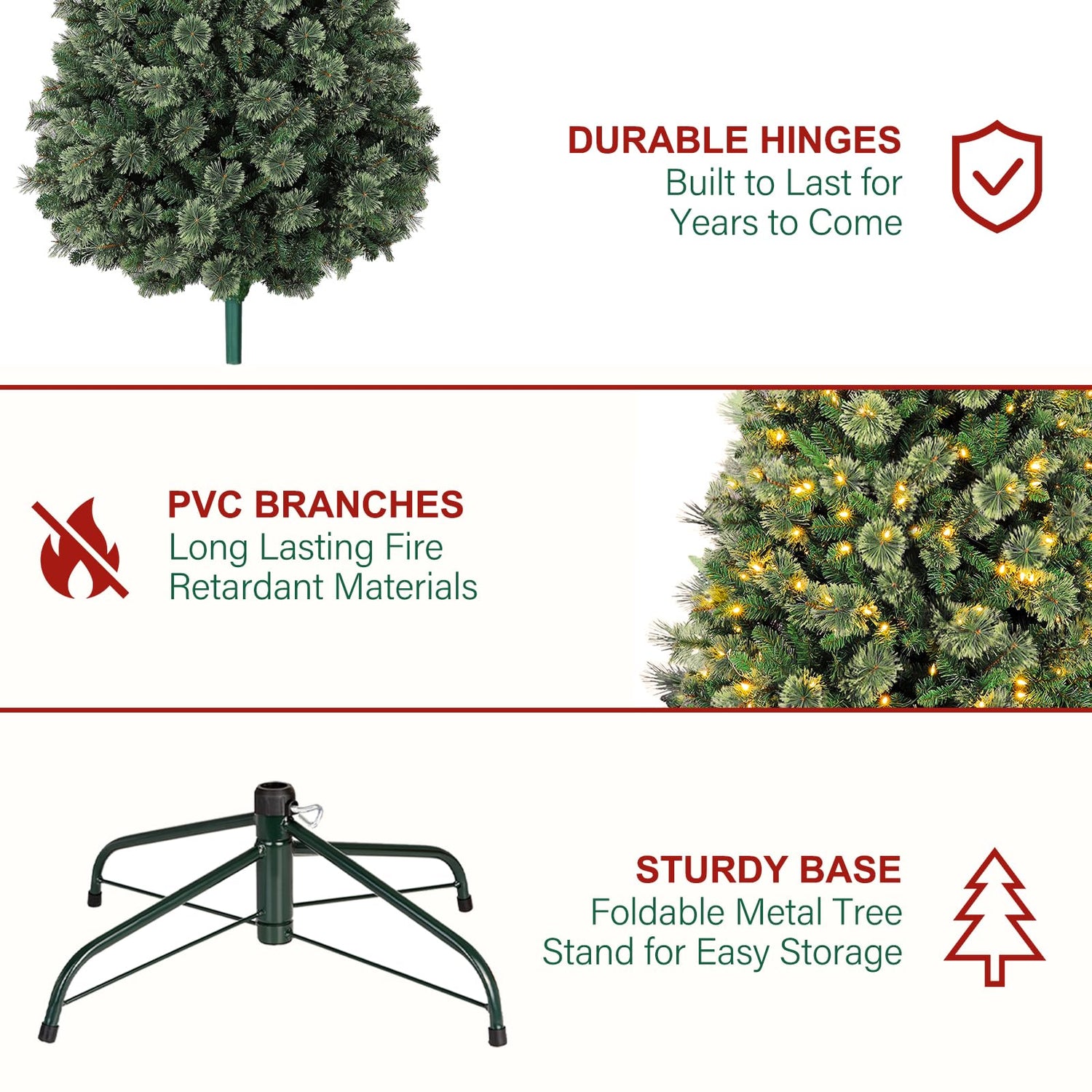 - EASY TO SET UP AND STORE: This tree features convenient hinged branches, which allows for ease of assembly and disassembly. All the limbs are hinged around the center pole, the branches easily fall into place during set-up and fold back up for storage.