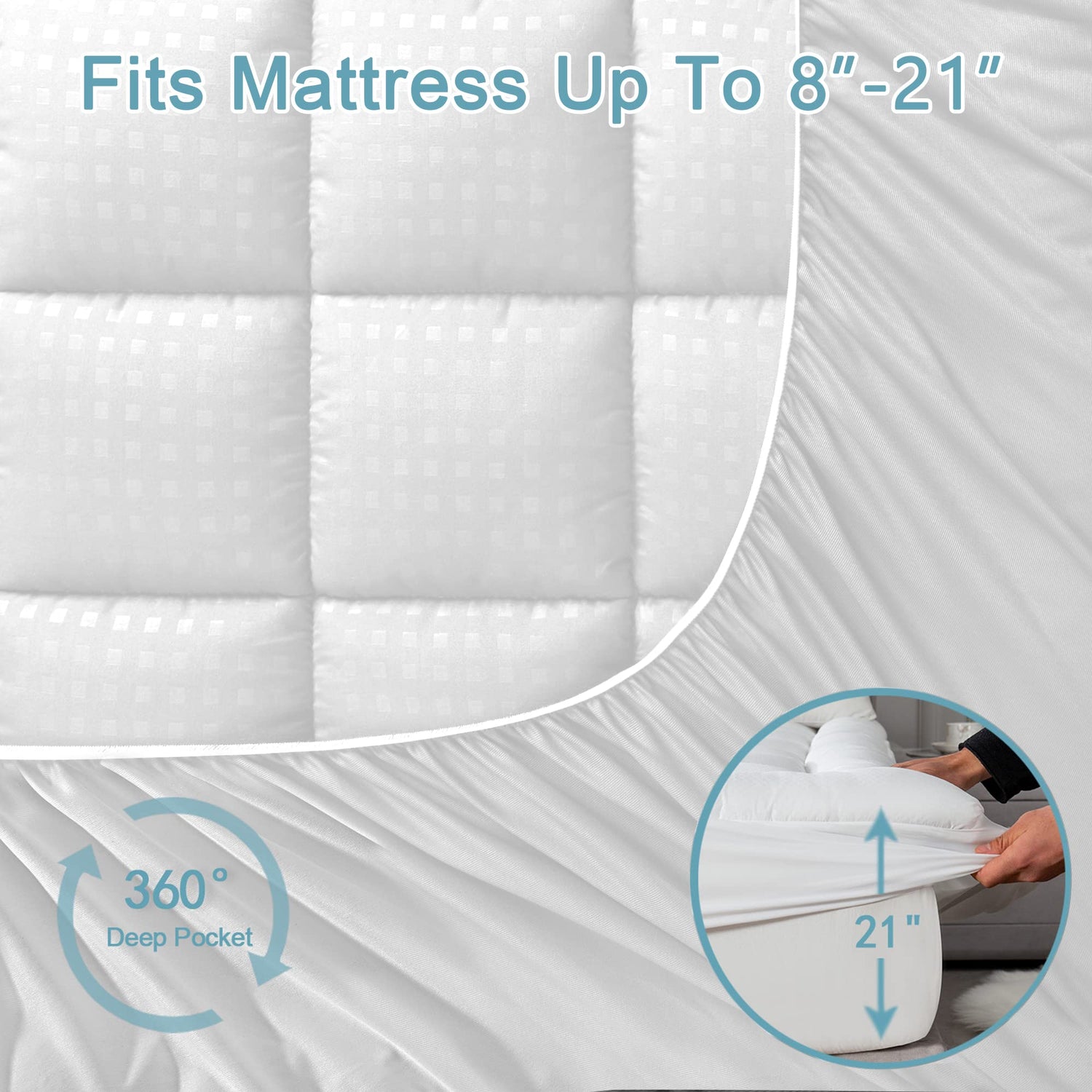 - ❤Mattress Pad with Deep Pocket❤: The 360° fabric sides easily stretch to fit mattresses up to 21" thick. It can be easily placed on most mattresses, whether it's a regular mattress, a waterbed, or memory. It will never slide no matter how you twist and turn in your bed