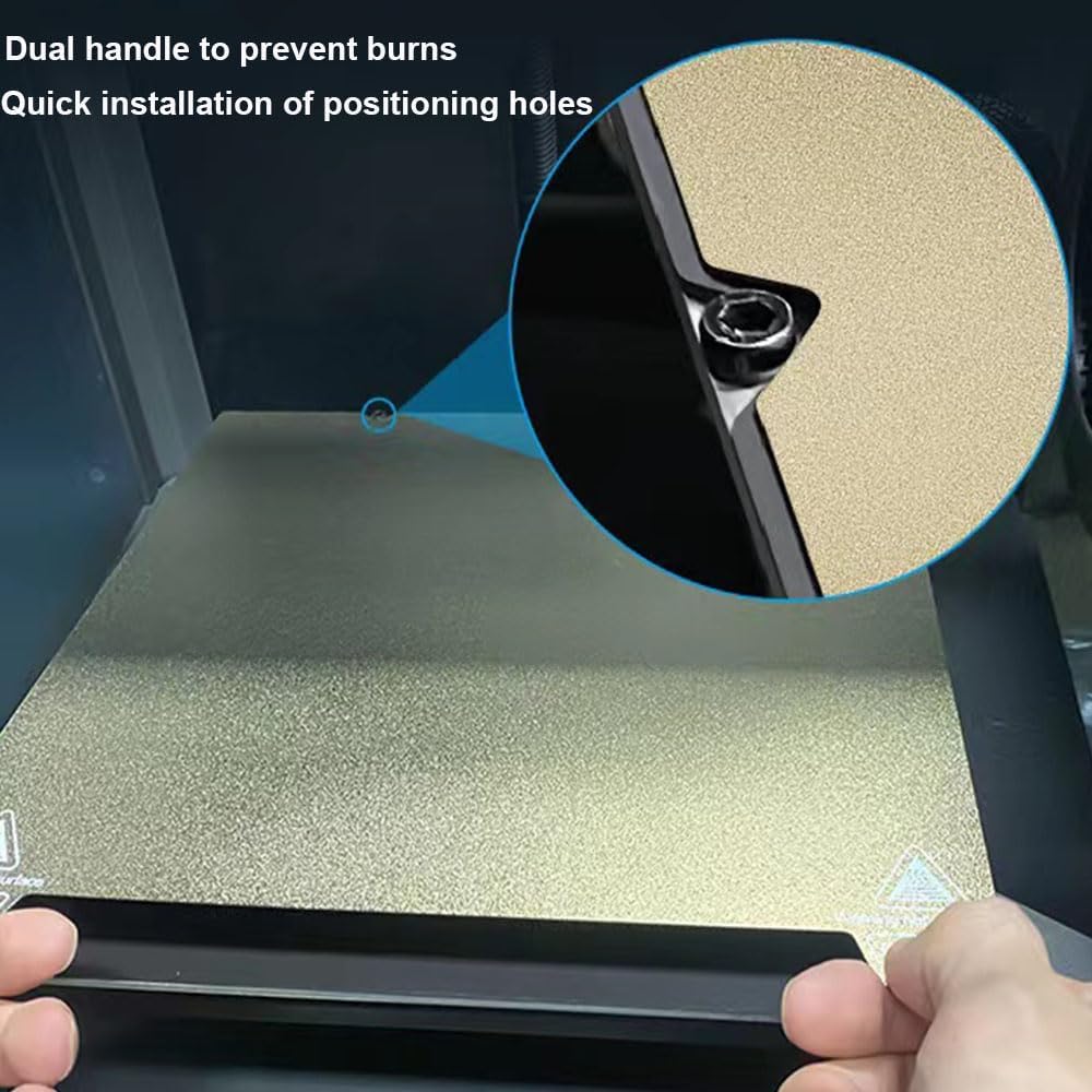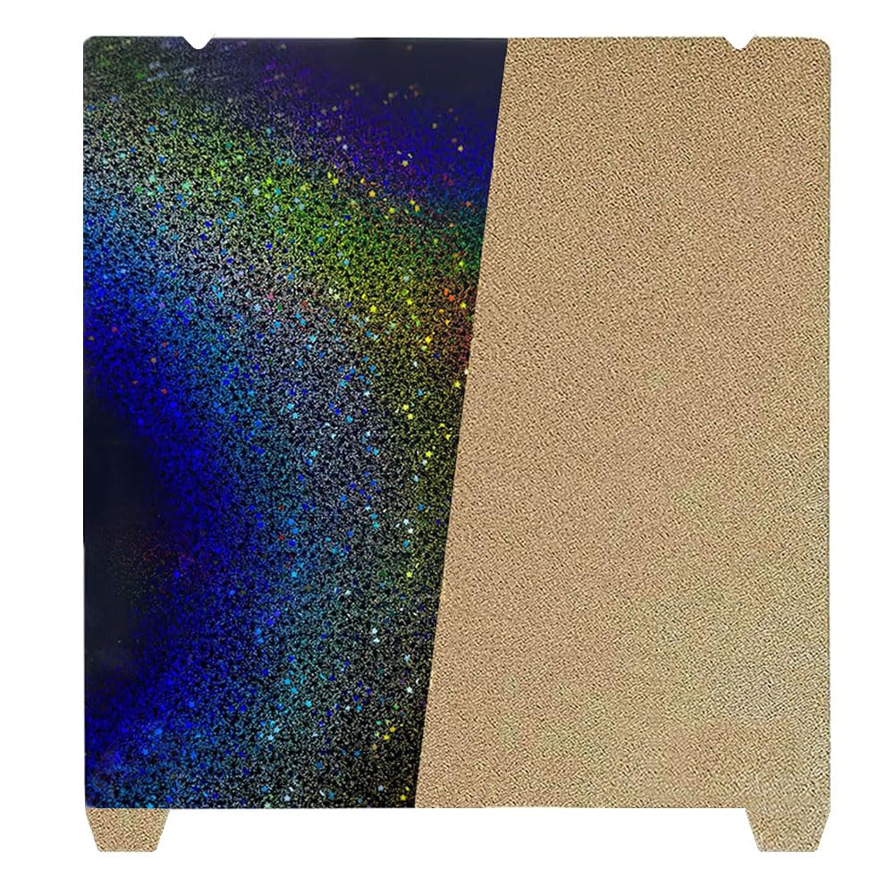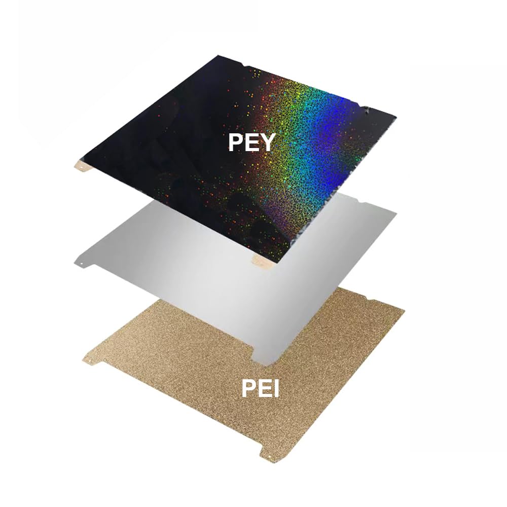 - PEI+PEY Design: One side is a textured PEI bed which presents the frosted sticker surface with a distinctive frosted touch. Another side is smooth PEY sheet which has a pattern of stars and dots that will shine brightly. It presents different patterns under different intensities of light. What's more, different colors will be left on the printing model.
