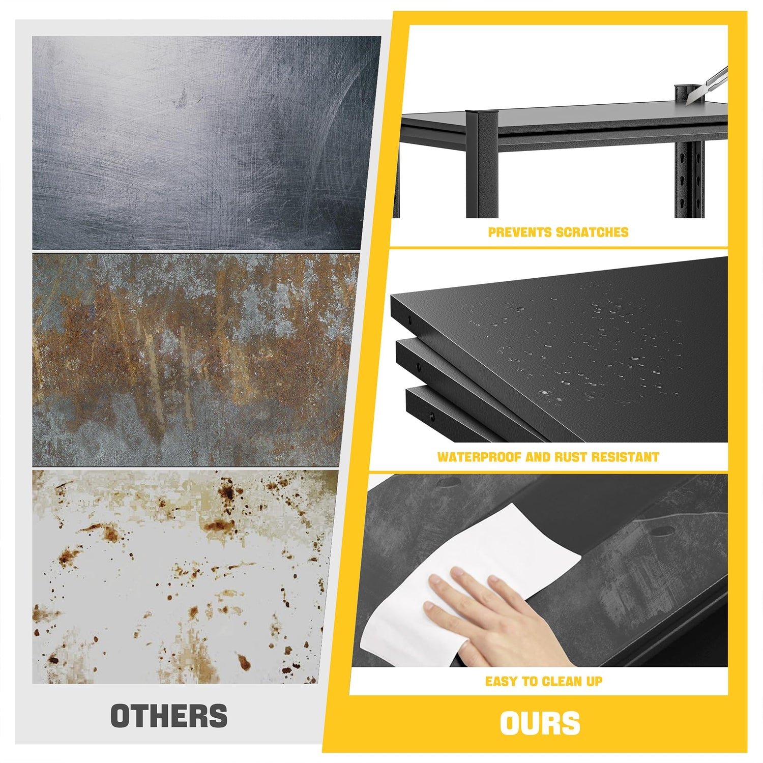 - 【RUST-PROOF, SCRATCH-PROOF, EASY-TO-CLEAN HEAVY DUTY SHELF】The garage shelving is treated with anti-rust spray paint, the metal material and special surface treatment can prevent the rust problem caused by the humid environment; the smooth metal surface design makes this shelf very easy to clean and take care of daily. Each shelf is equipped with protective pads to protect floors from damage.