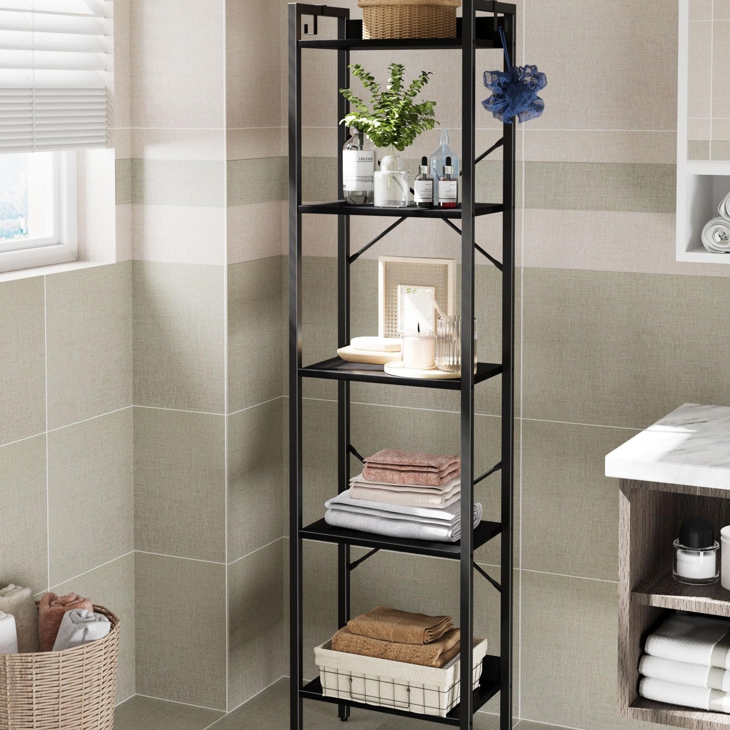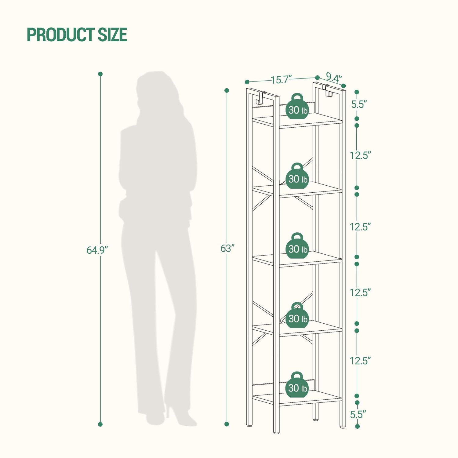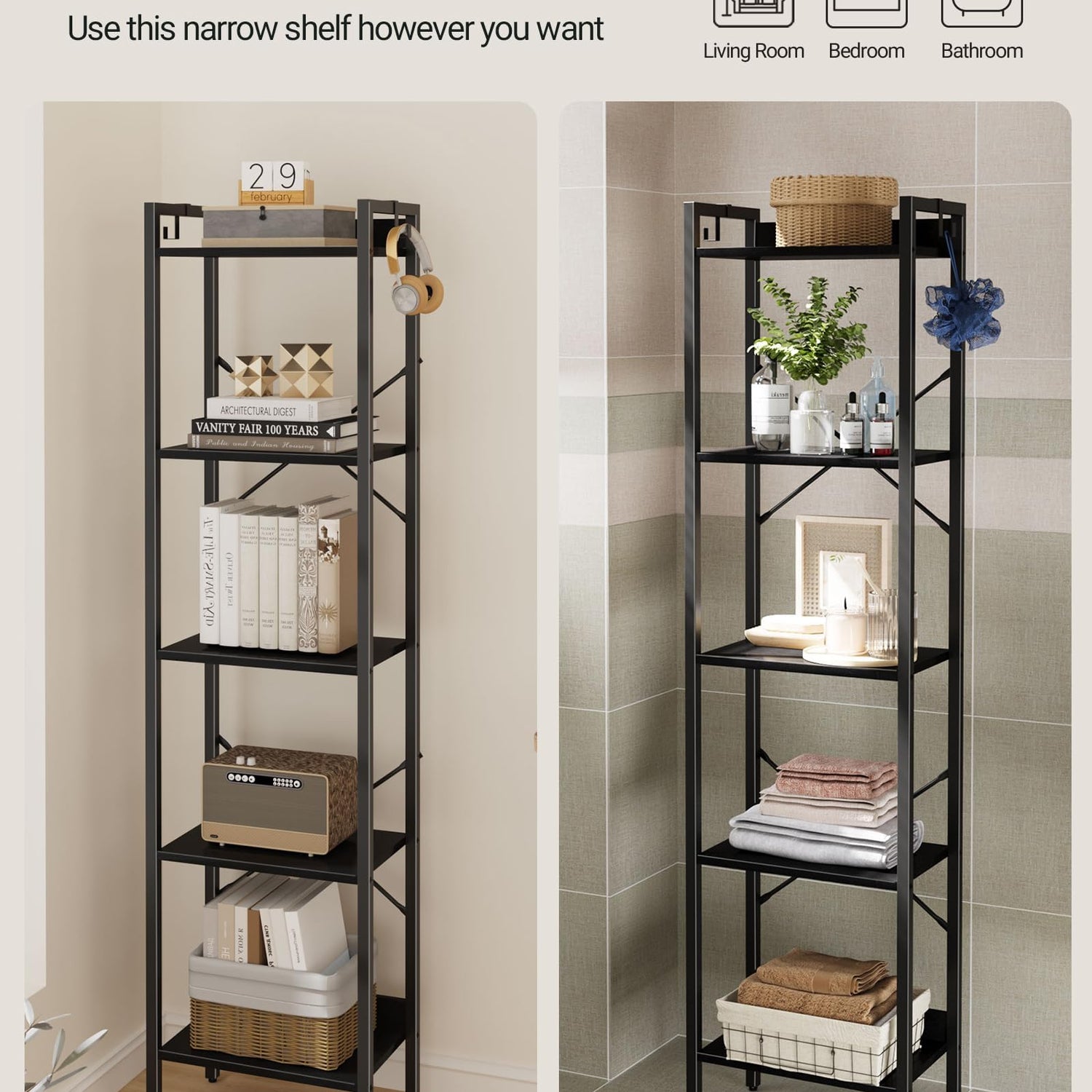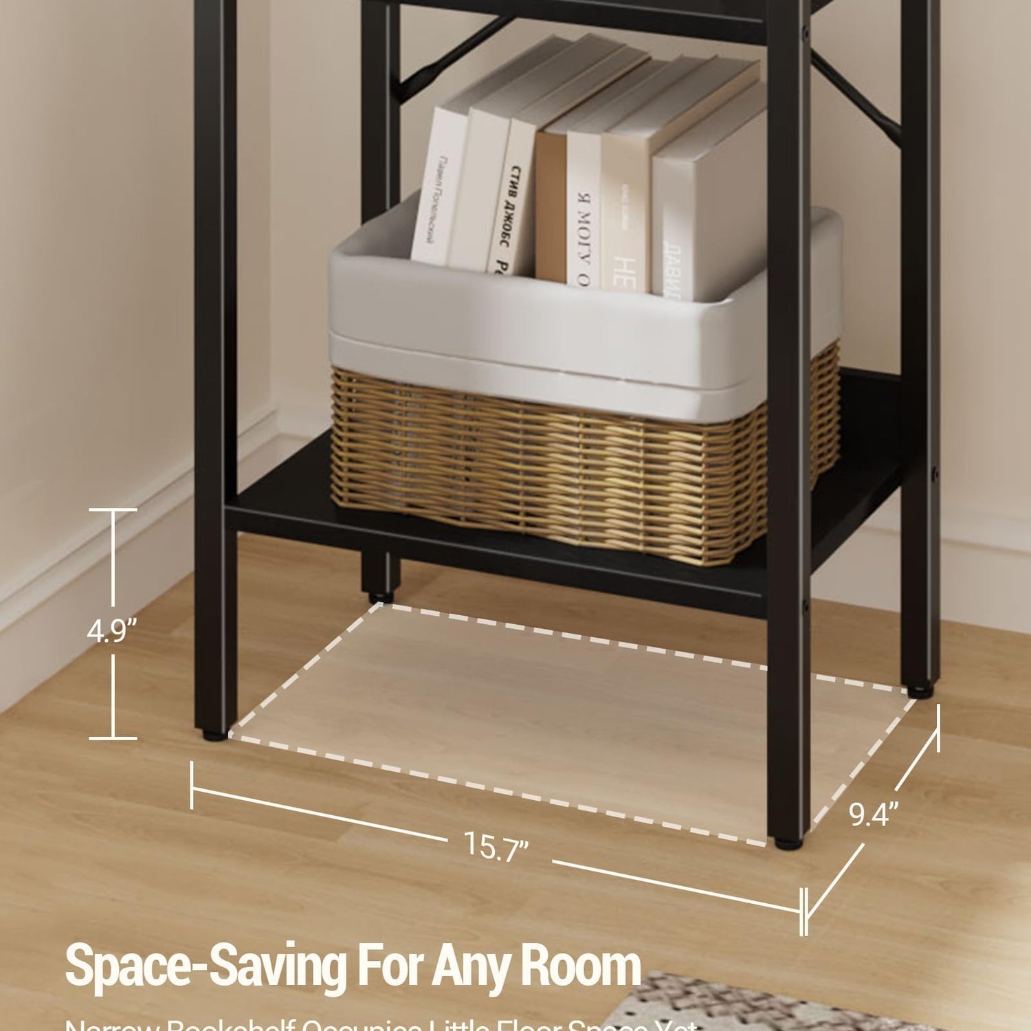 - [Space-Saving for Any Room] This 9.4"D×15.7"W×61"H narrow bookshelf occupies little floor space yet offers you 5 tiers of vertical storage, making full use of the small spaces in your home office, living room, Kitchen,bedroom, balcony or entryway