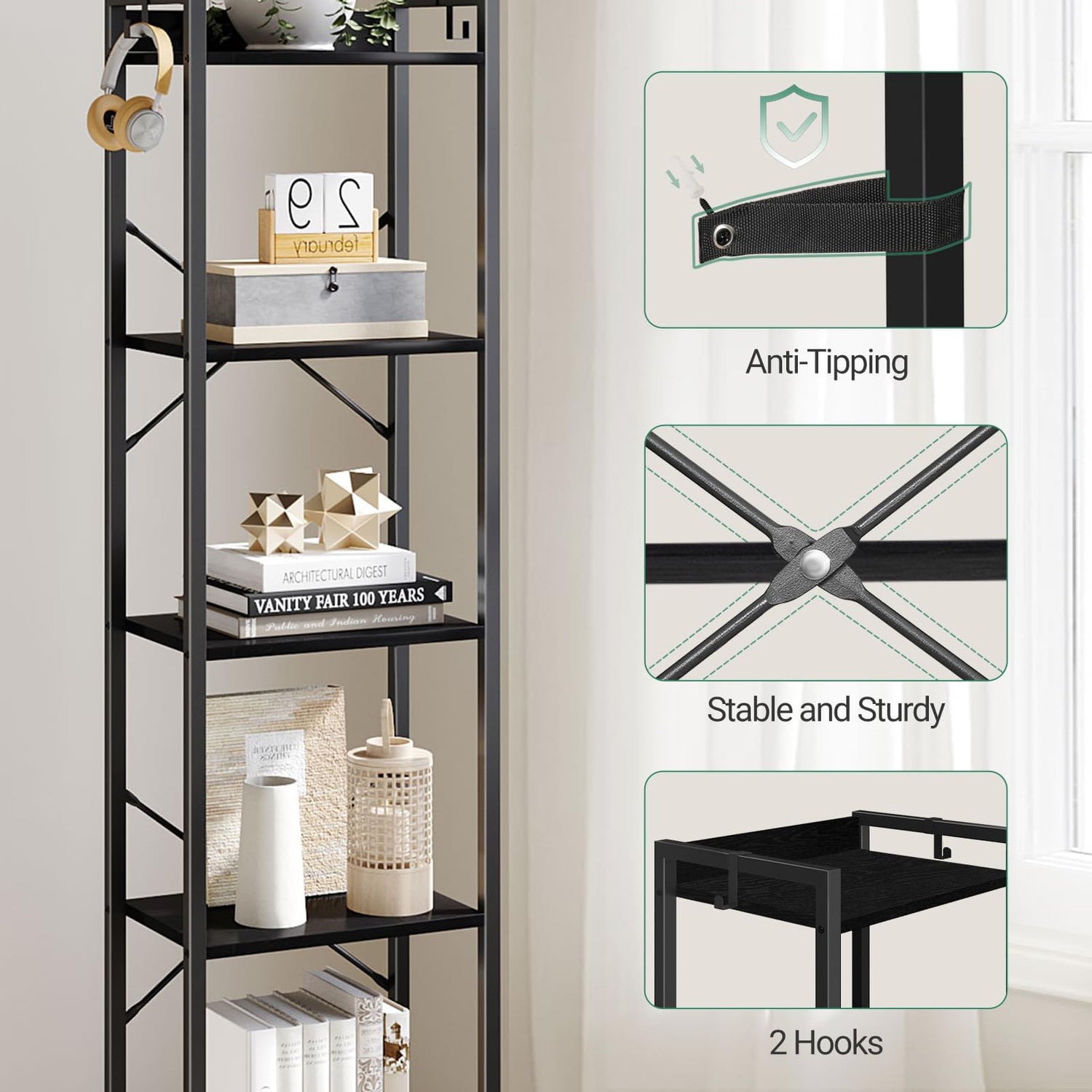 - [Stable and Safe] X-shaped bars reinforce the structure, adjustable feet keep this tall book shelf balanced on slightly uneven floors, and the included anti-tip kit will help you fix it to the wall for greater stability and safety
