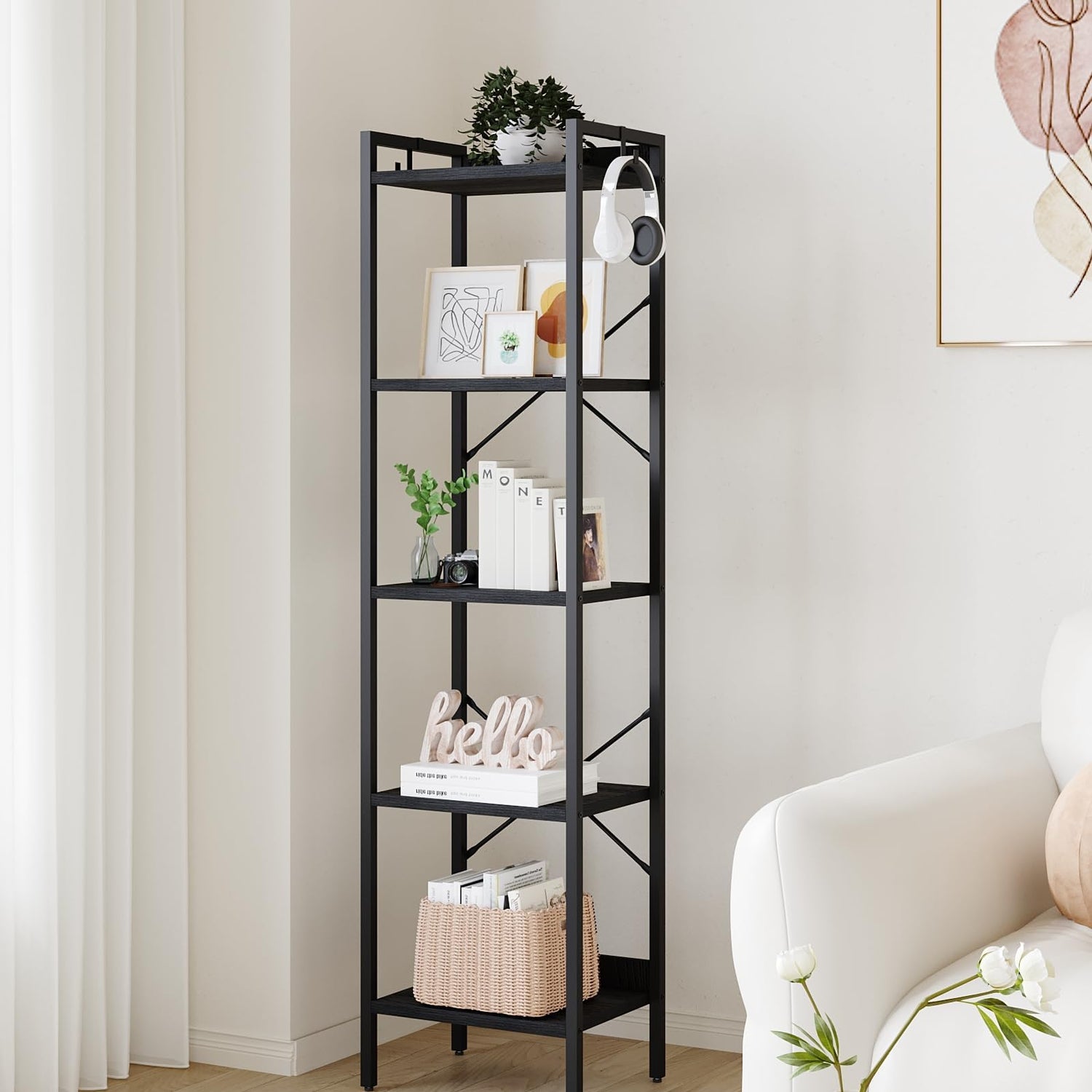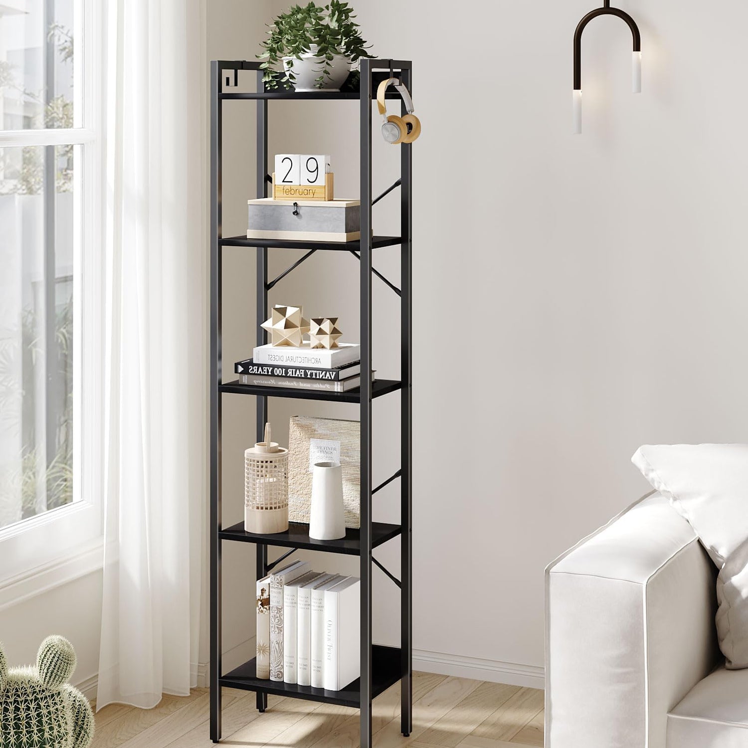 Hzuaneri Bookshelf, Book Shelf, Industrial Bookcase with 2 Hooks, Coner Shelf Storage Organizer for Home Office, Living Room, Bedroom, Kitchen, 5-Tier Black BC10504B