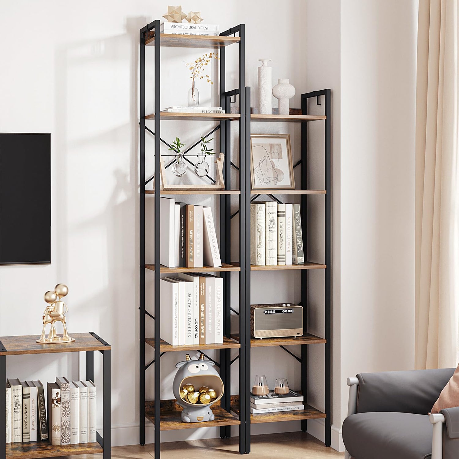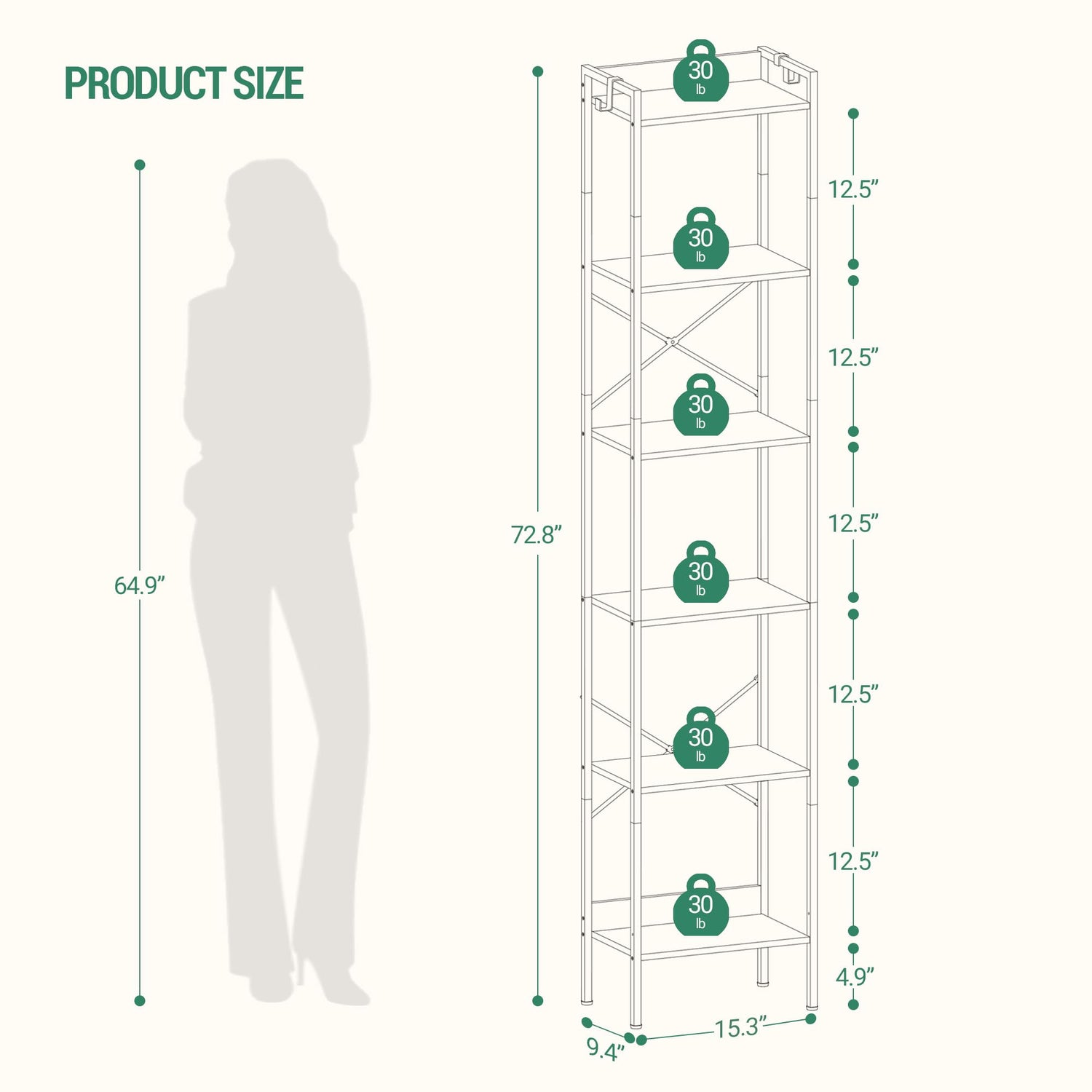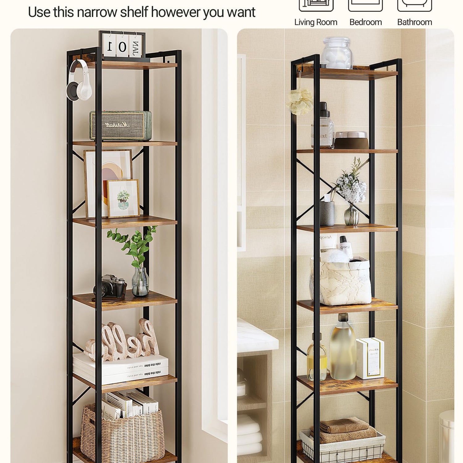 Introducing the Hzuaneri 6-Tier Rustic Brown Industrial Bookshelf, the perfect solution for your space-saving storage needs. With dimensions of 9.5 inches deep, 15.3 inches wide, and an impressive height of 72.8 inches, this narrow bookshelf is designed to fit seamlessly into small areas around your home, including offices, living rooms, kitchens, bedrooms, balconies, or entryways.