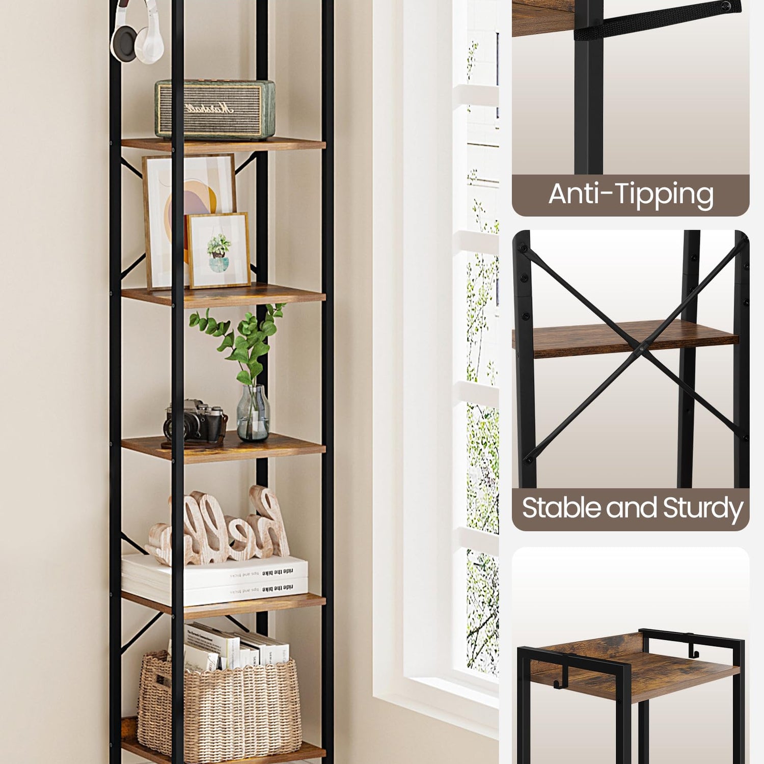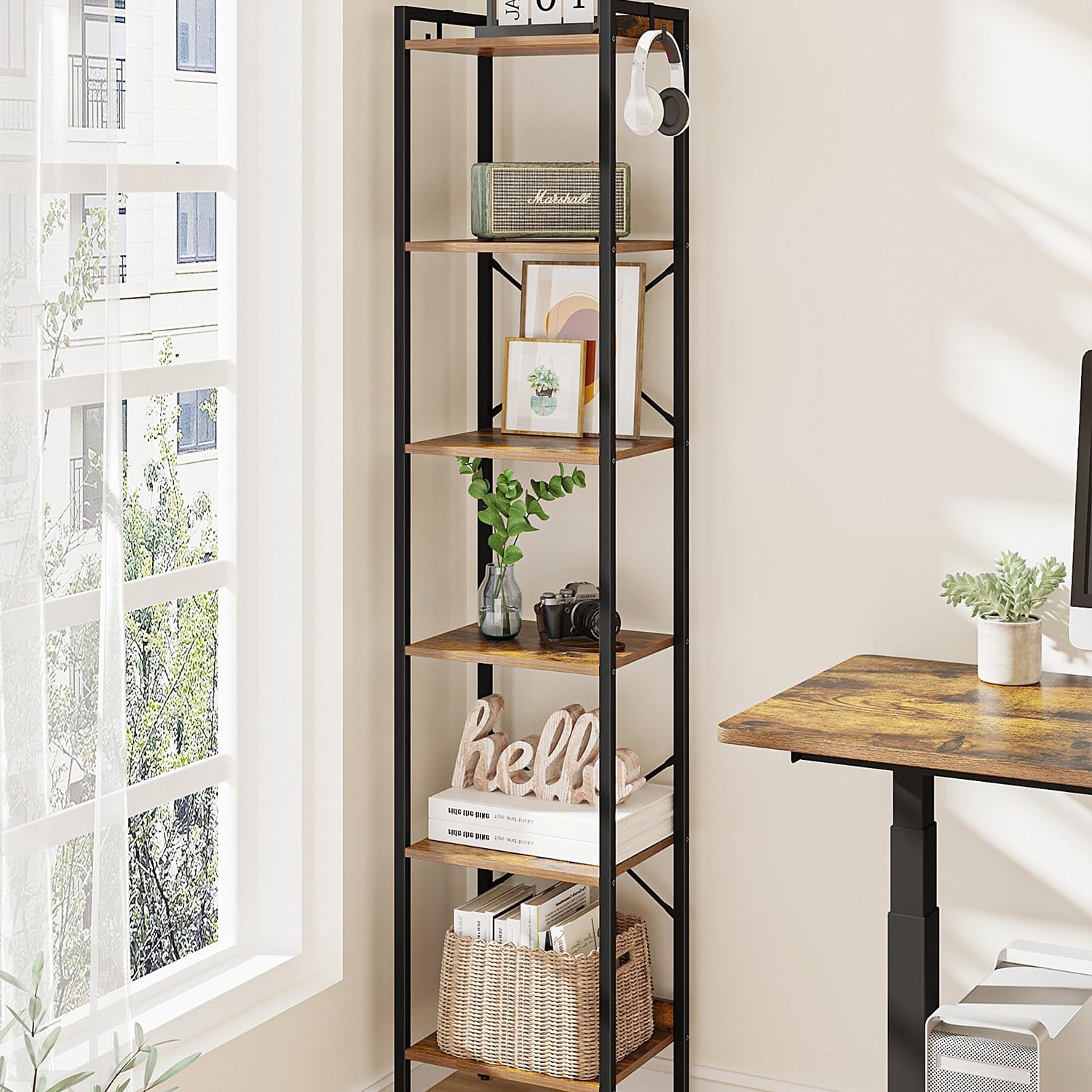 Hzuaneri 6-Tier Rustic Brown Industrial Bookshelf with Hooks for Space-Saving Storage
