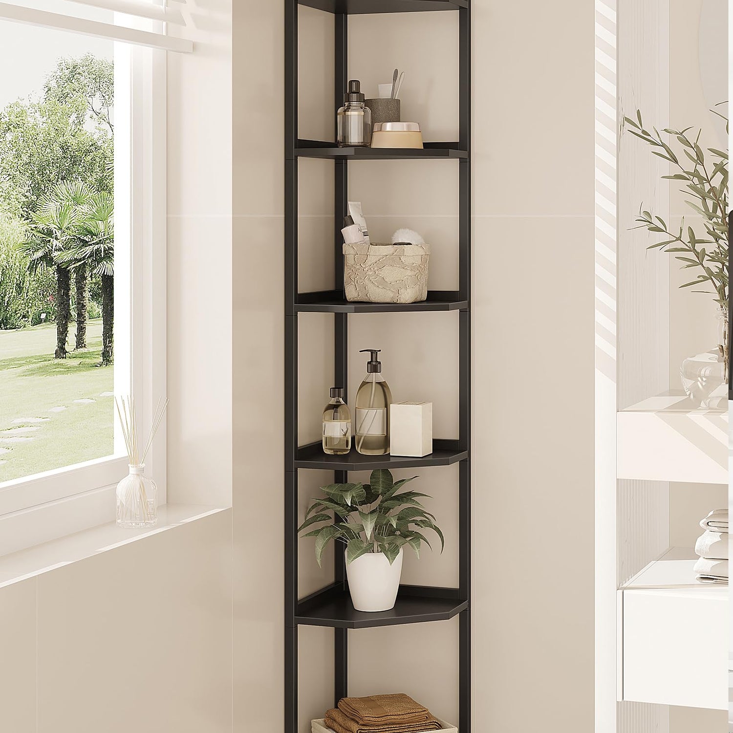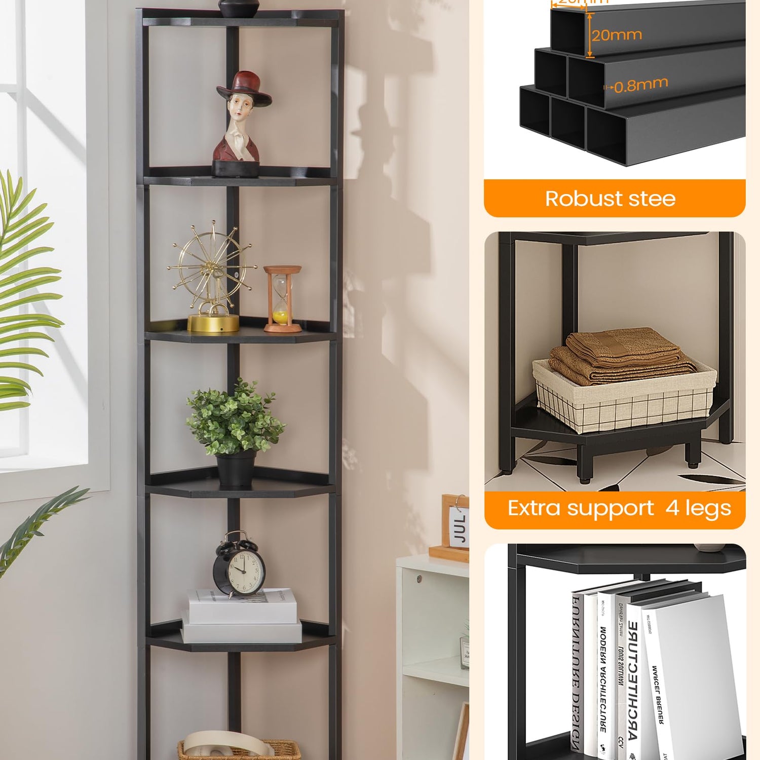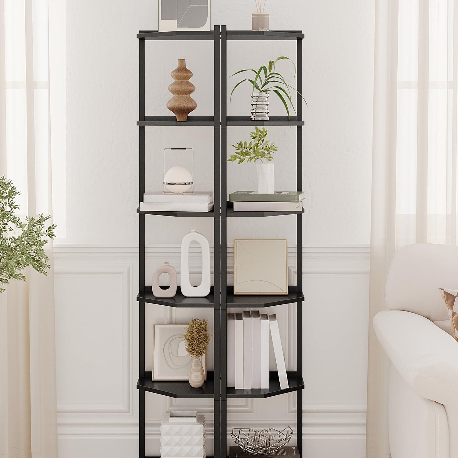 Hzuaneri Corner Shelf Stand, Corner Bookshelf, Storage Standing Shelf Unit with Metal Frame, Plant Stand, Corner Bookcase for Living Room, Home Office, Bedroom, 6-Tier Black CS06006B