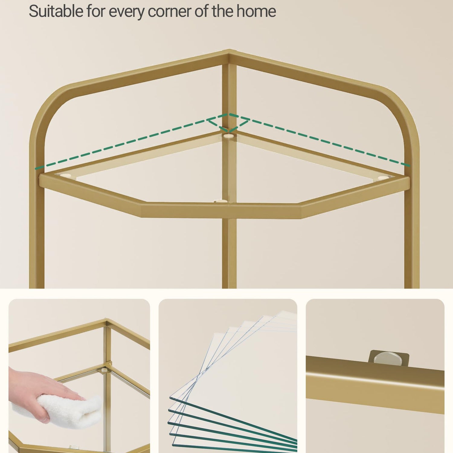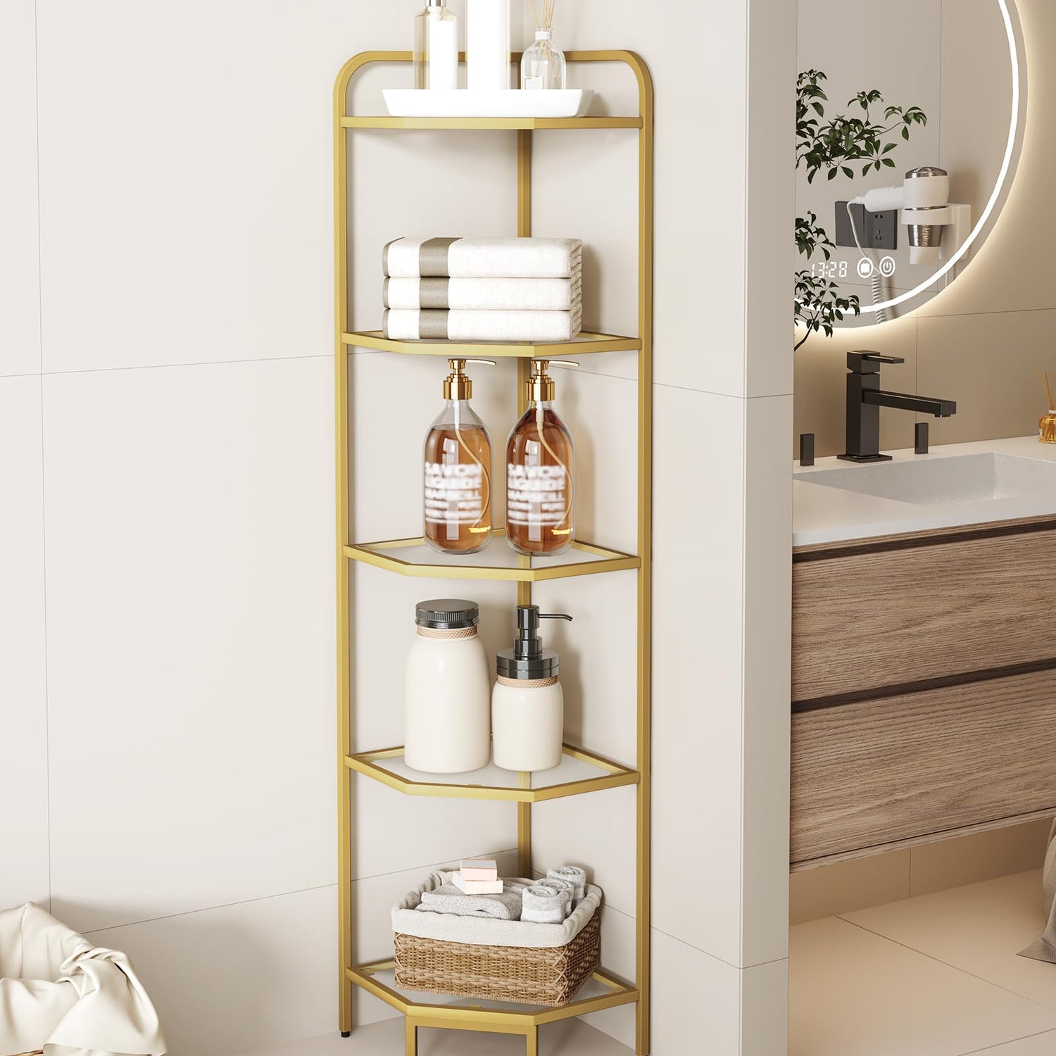 Hzuaneri Corner Shelf Stand, Glass Bookshelf Bookcase, Bathroom Organizer, Plant Stand, Steel Frame, Tempered Glass, Modern Style for Living Room, Bathroom, Kitchen, 5-Tier Golden CS90200G