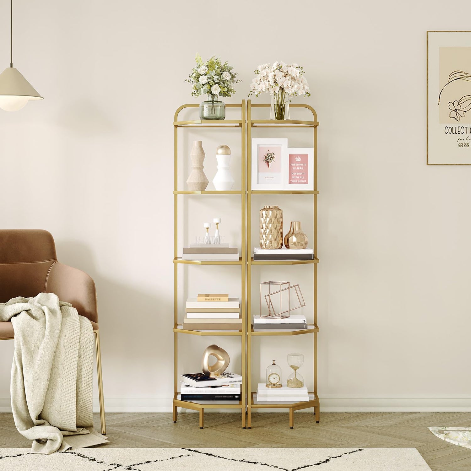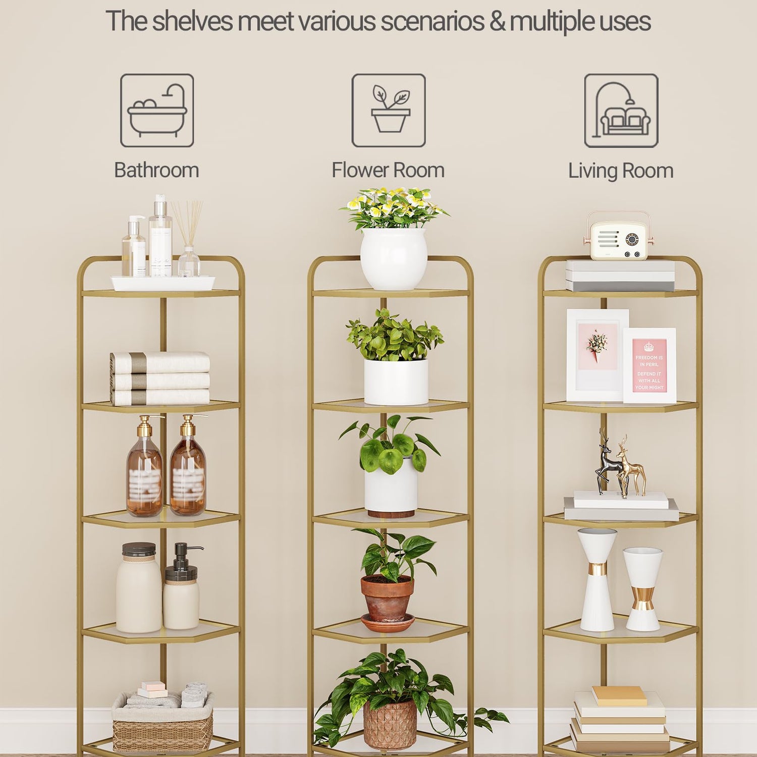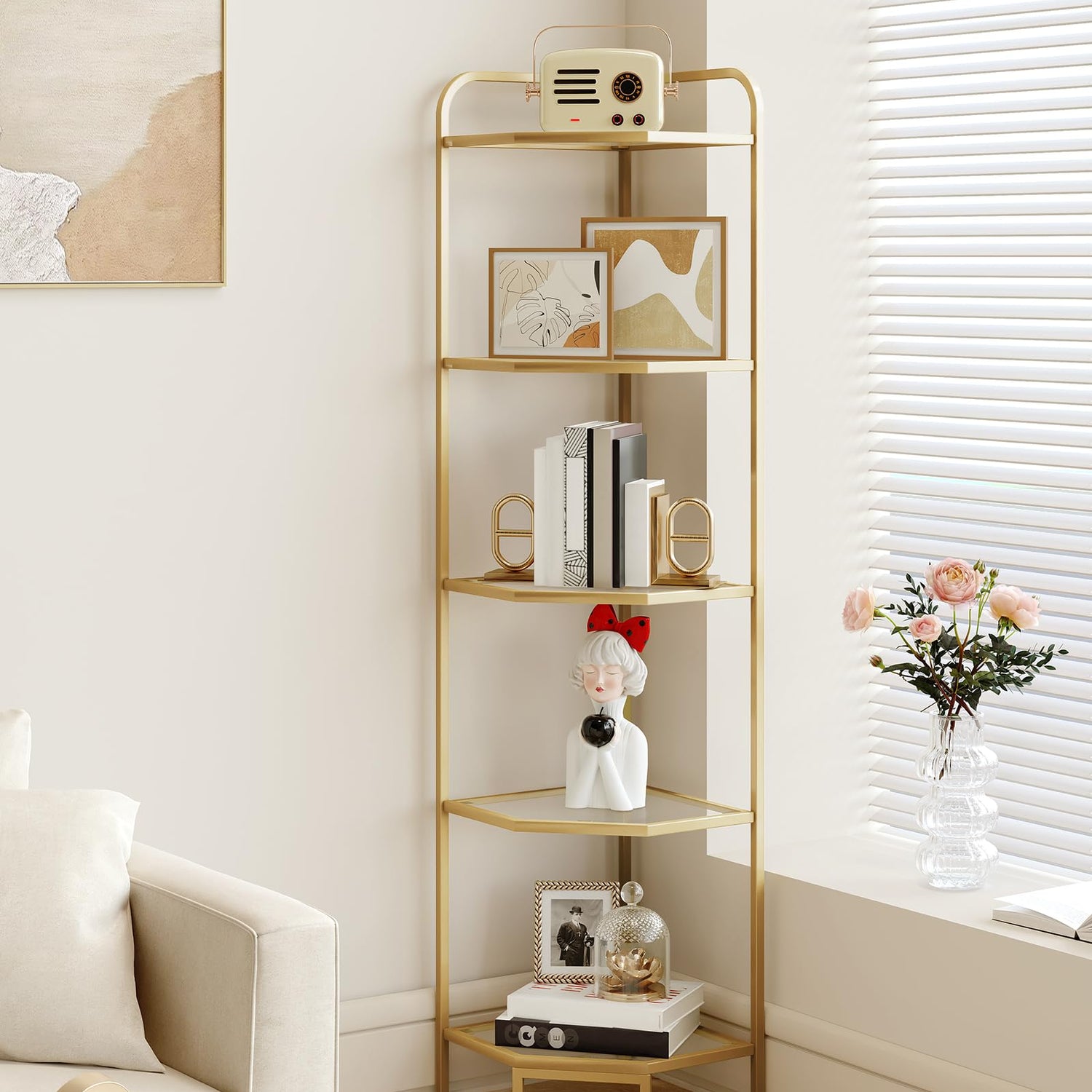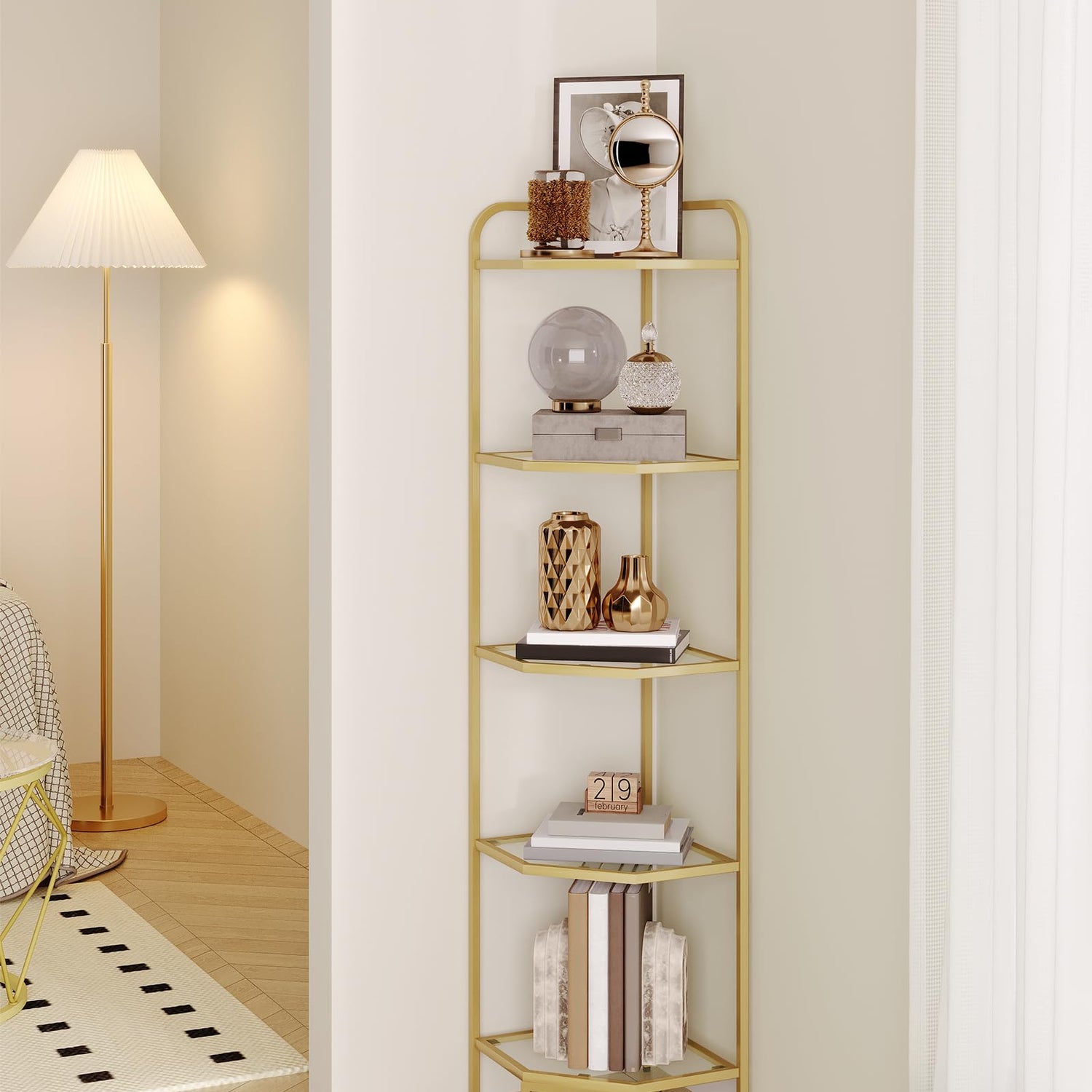 - [Stylish Design] This 5-tier corner shelf with gold finish adds a touch of elegance to your living room or bedroom while also providing ample storage and display space for your books, photos, plants and other items. The triangle's rounded edges are smooth to protect you and your family from scratches.