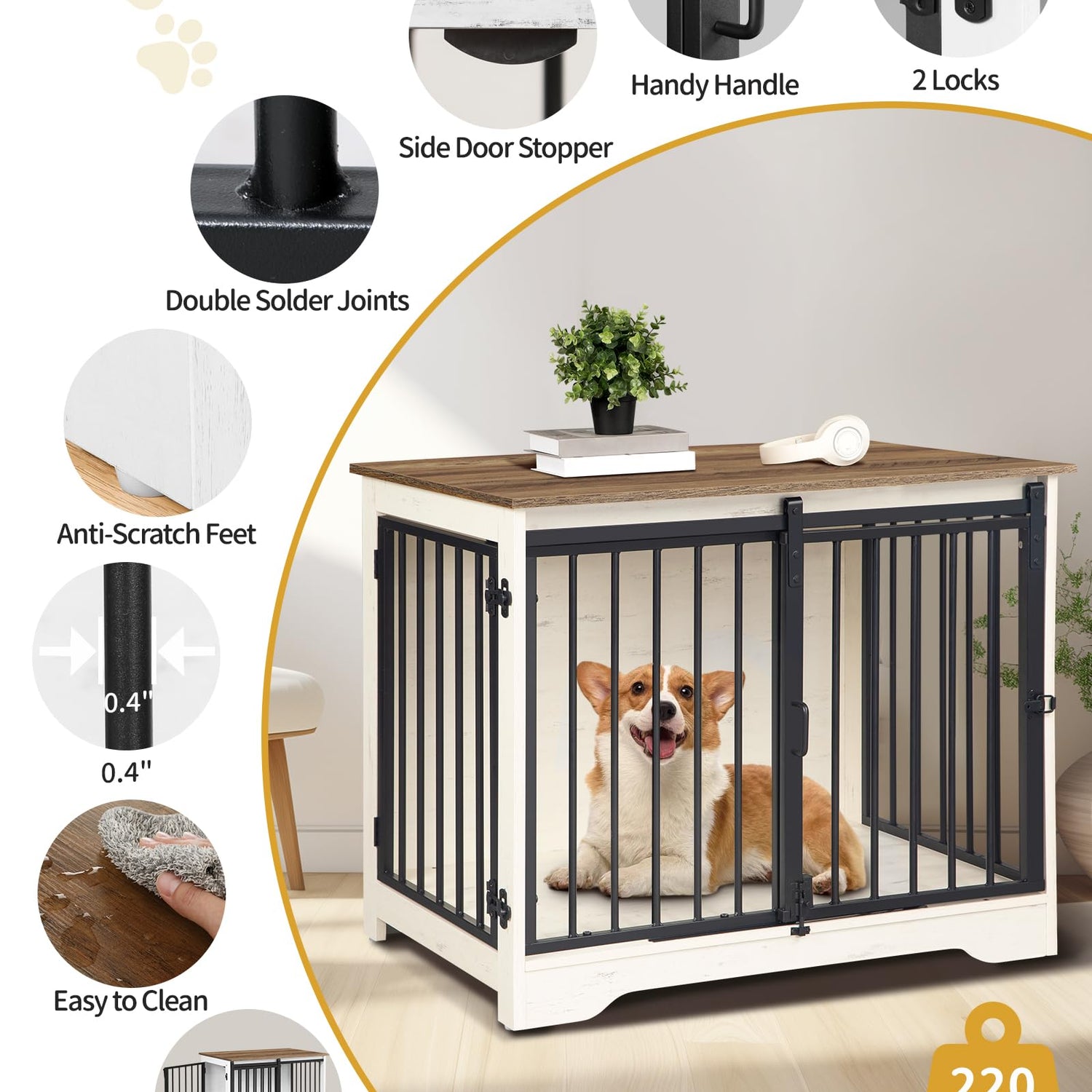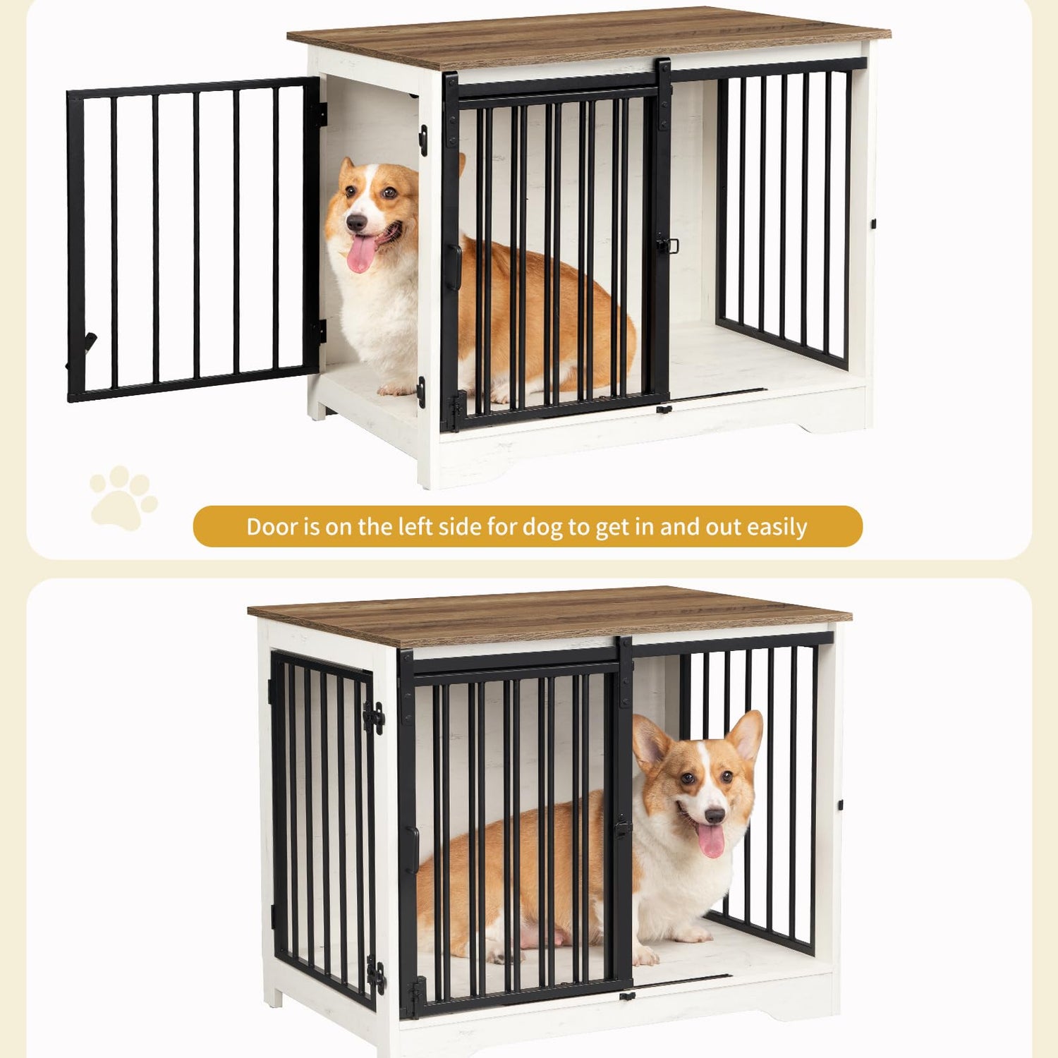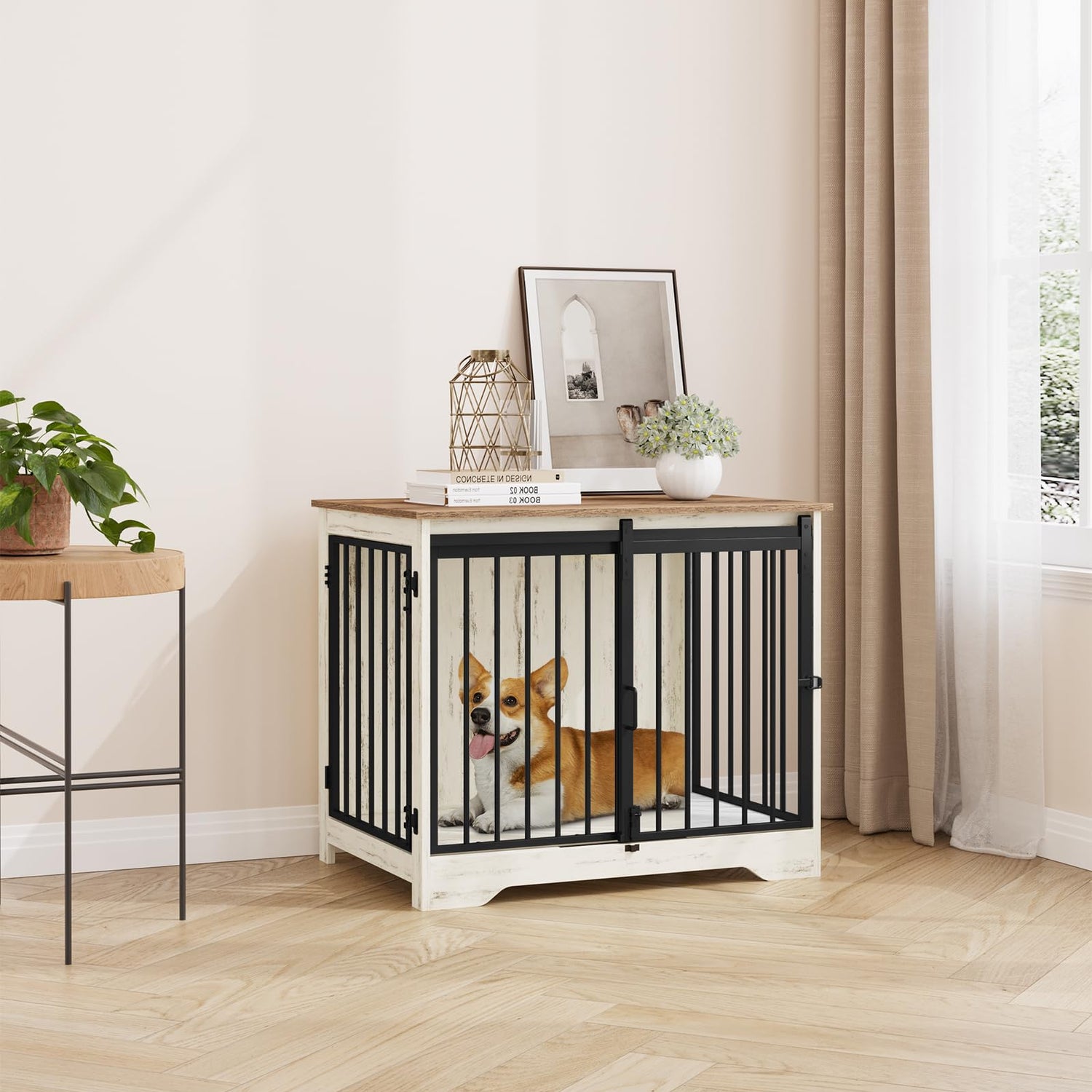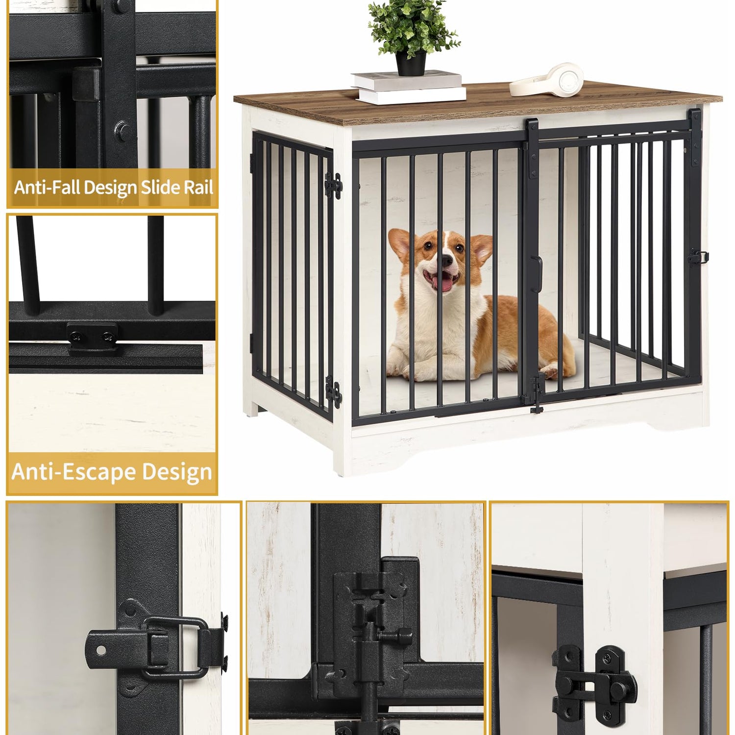 Hzuaneri Dog Crate Furniture, 32" Double Door Dog Crate with Barn Door, Dog Kennel Indoor, End Side Table Wooden Dog Crate for Small Medium Large Dog, Anti-Chew Anti-Escape, White Brown