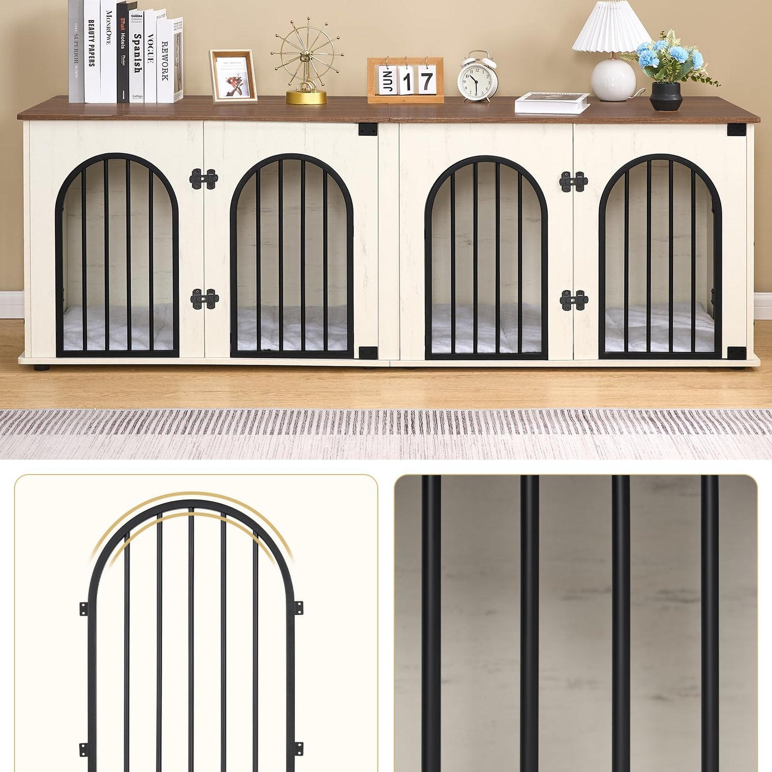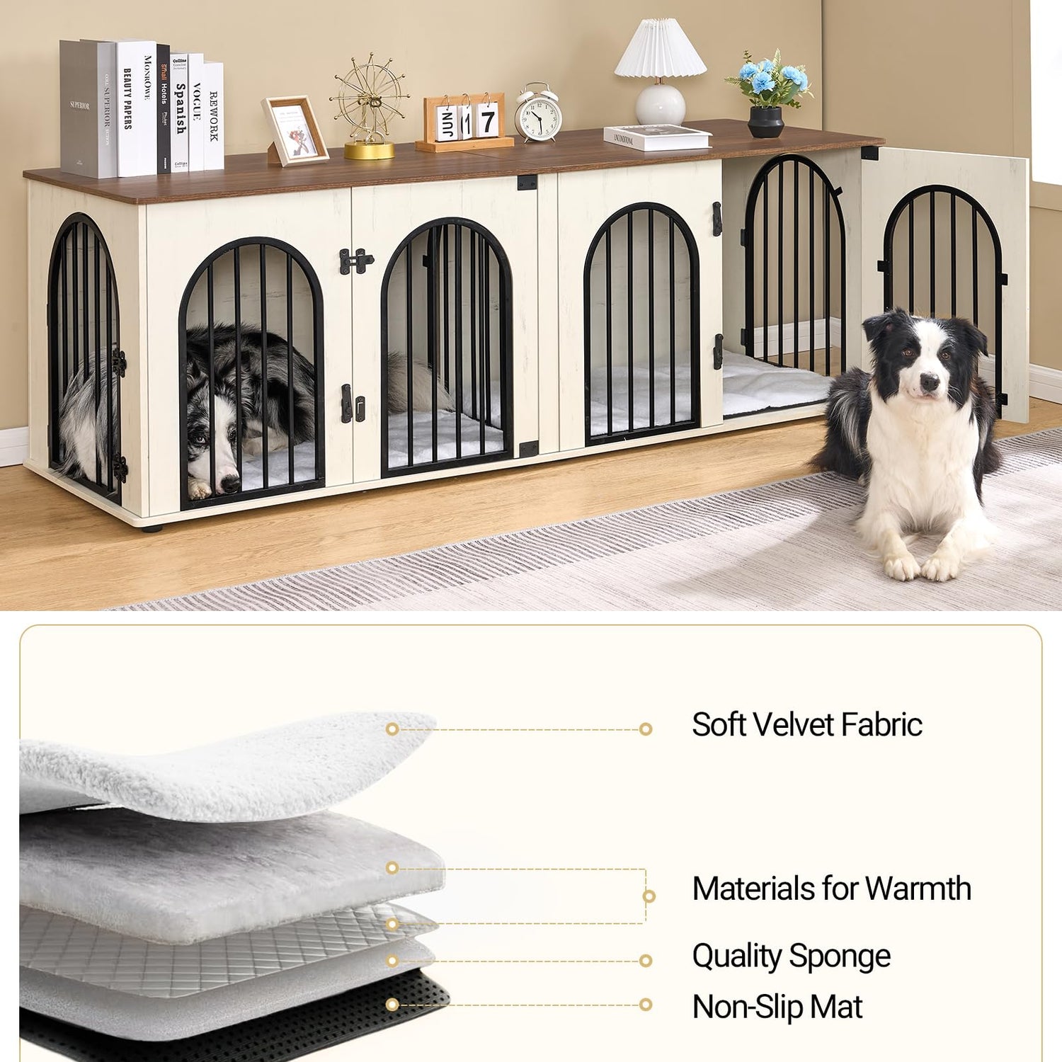 - 🐶Multi-Door Design: Our dog furniture crate features a unique arch door design that adds to its charm and beauty! The unique design allows for easy access from the front as well as the left and right sides, making it convenient for your beloved dogs to enter and exit. Additionally, each dog crate comes with a soft waterproof cushion, providing the perfect spot for your dogs to rest and relax.
