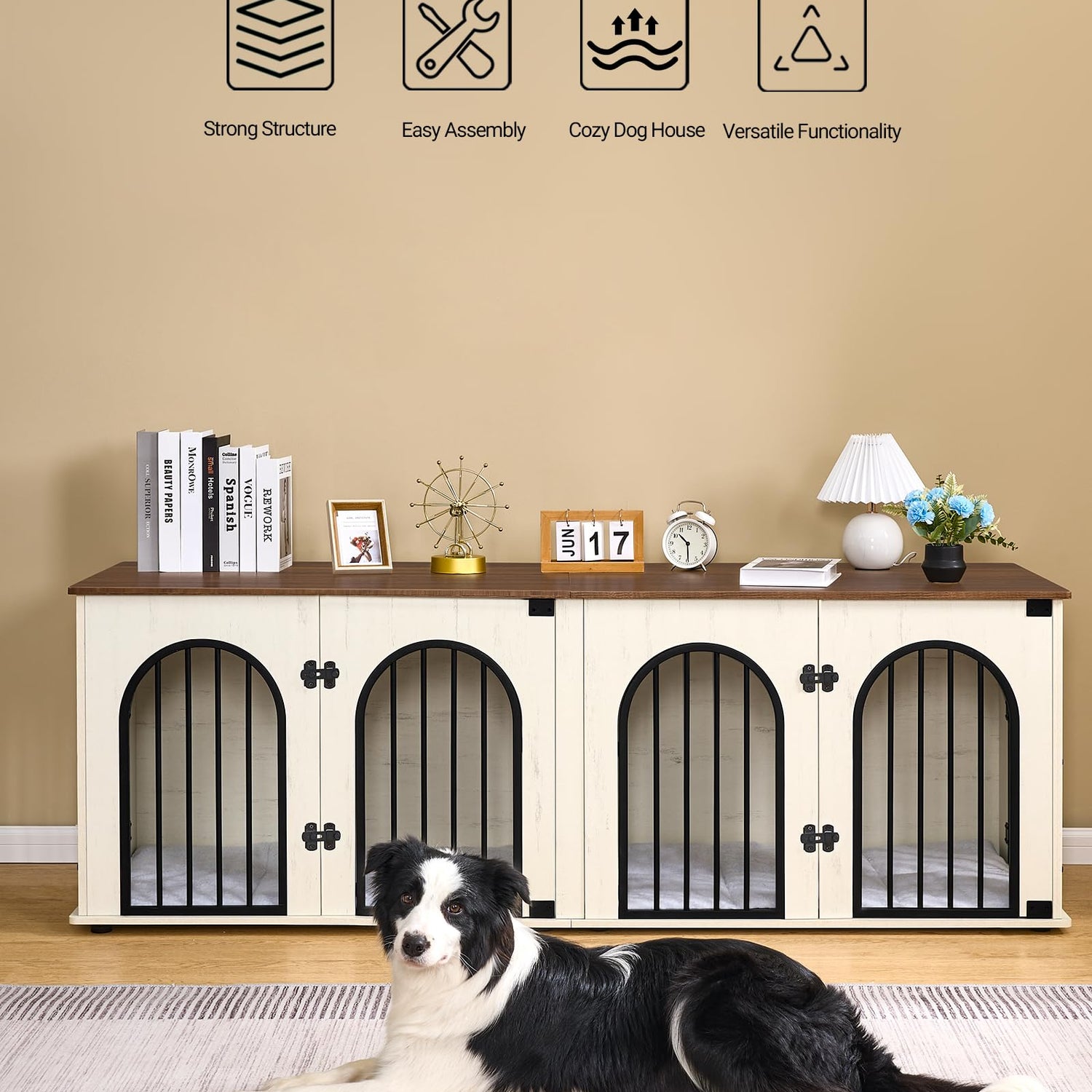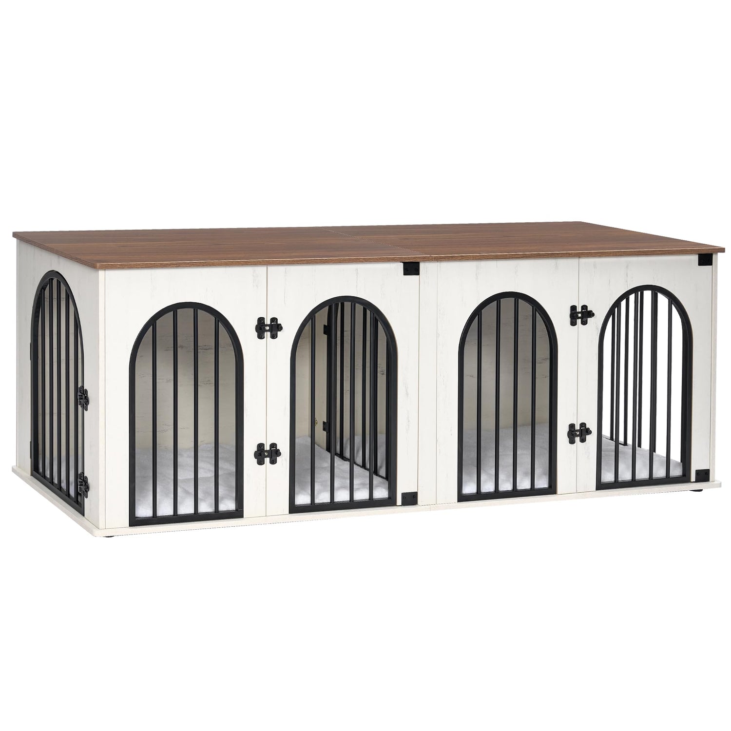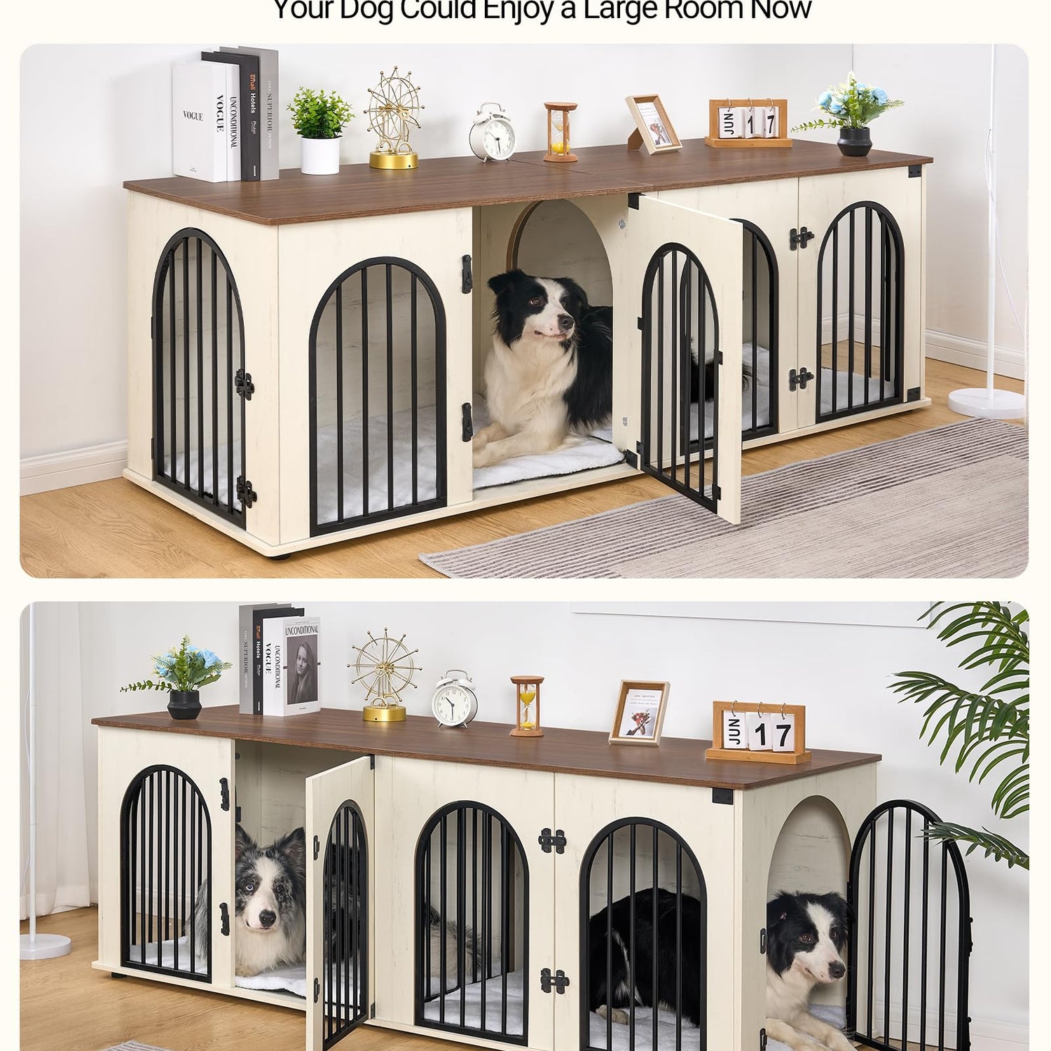 - 🐶2-In-1 Double Dog Kennel: Every dog has a different personality. Some dogs need their own space, and some dogs want to close each other. Our wooden dog crate furniture is designed with the living habits of different dogs in mind, so the middle divider is removable, allowing you to create one or two separate rooms based on the needs of your dogs. Furthermore, the spacious interior and weight capacity of up to 330 lbs provide enough room to place decorations or other items, making it not just a dog crate but also a functional piece of furniture.