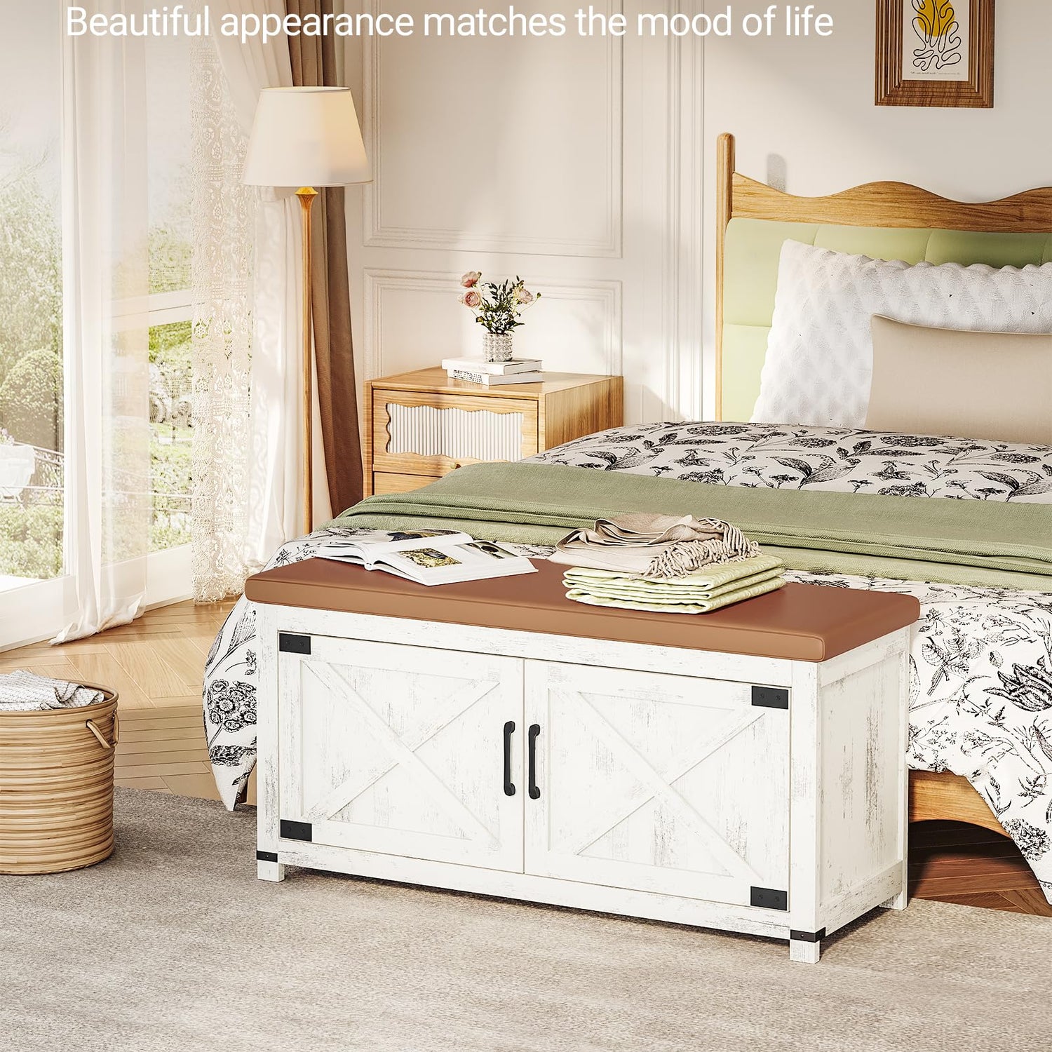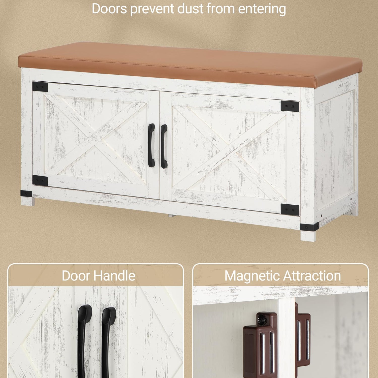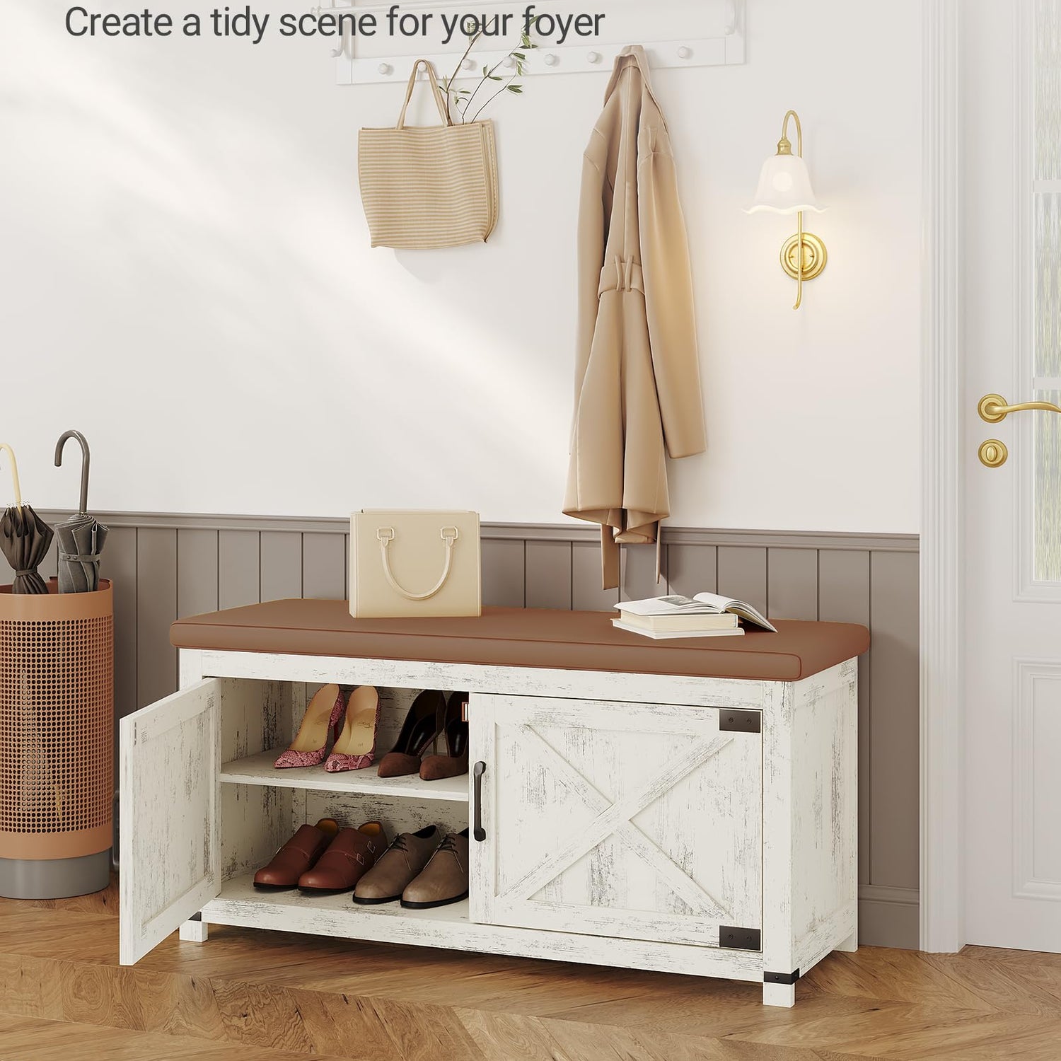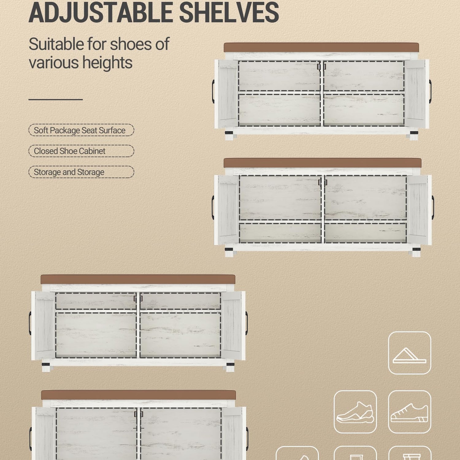Hzuaneri Farmhouse Shoe Storage Bench, 2 Tier Shoe Bench with Padded Seat Cushion & 2 Barn Doors, Entryway Bench with Adjustable Shelf, Shoe Cabinet for Living Room, Bedroom, Antique White SB26614KA
