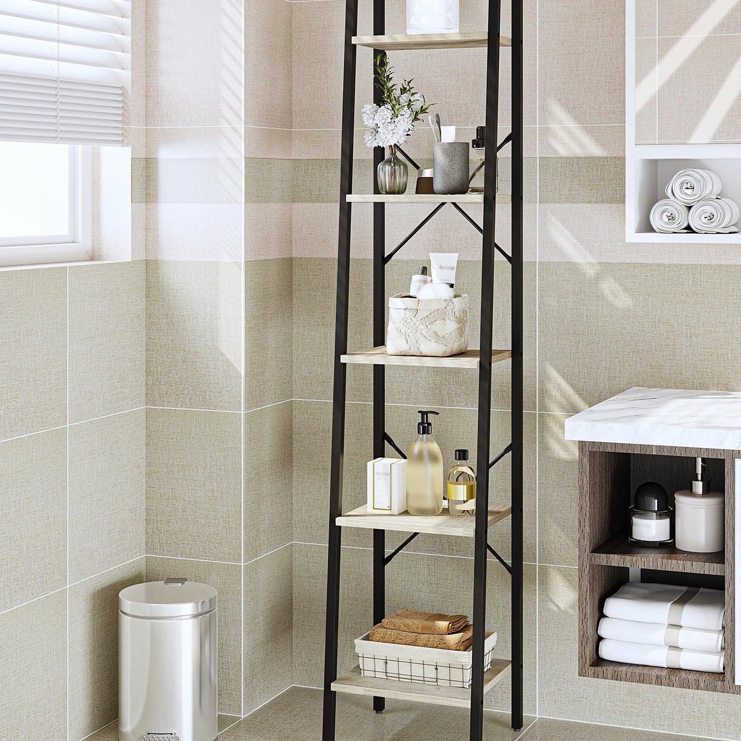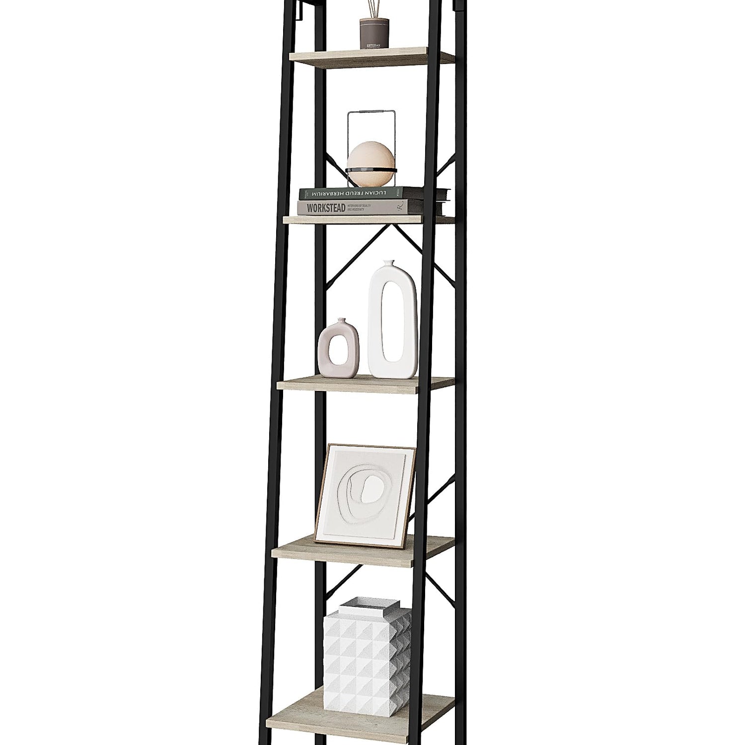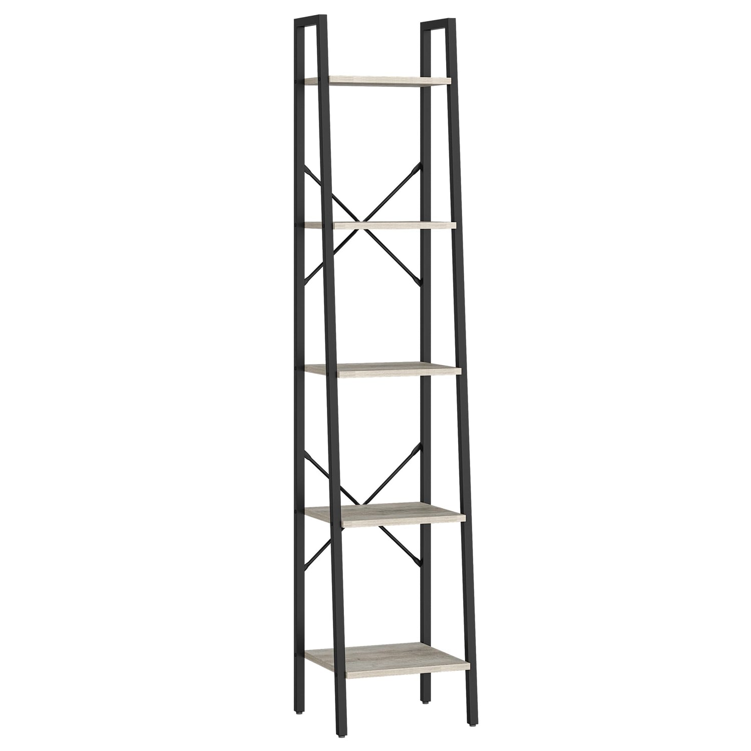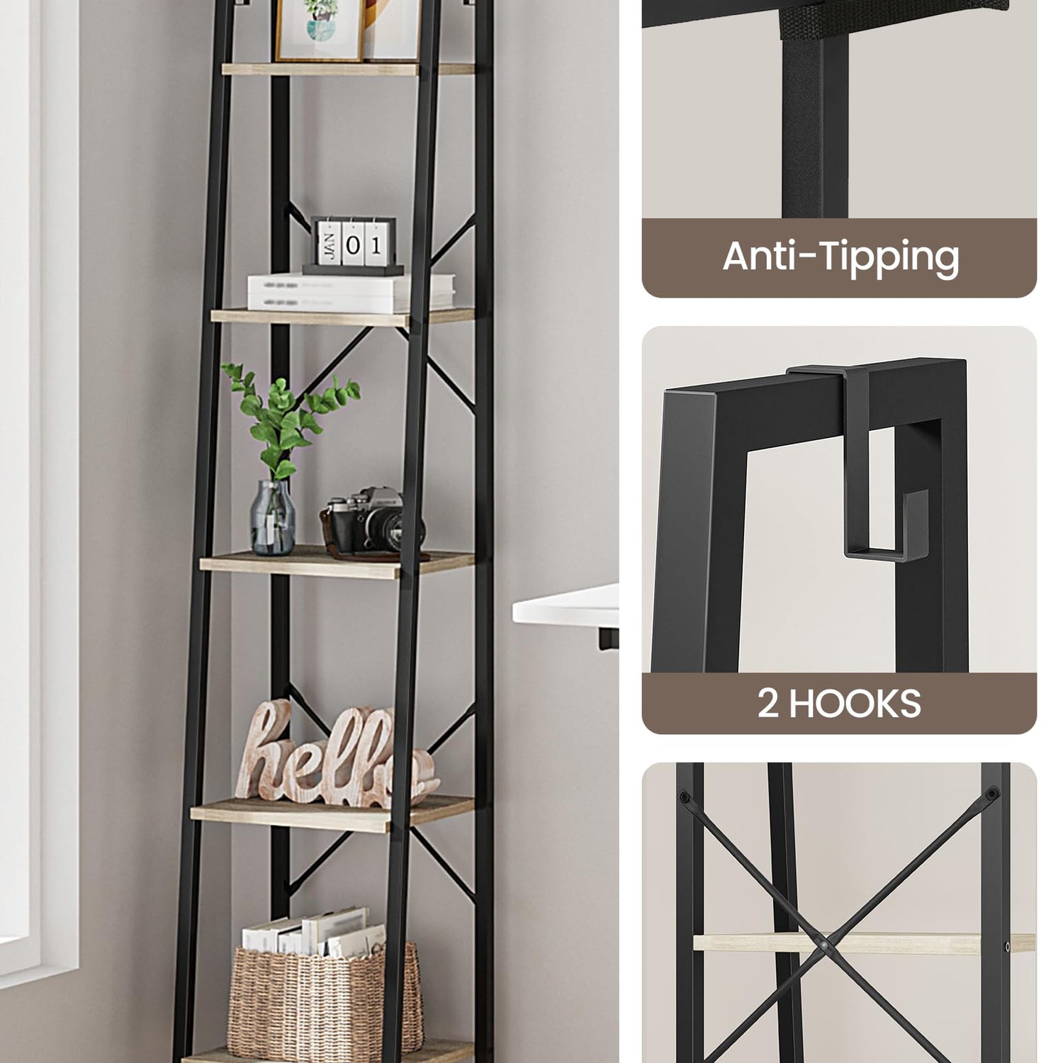 Hzuaneri Ladder Shelf, Bookshelf Bookcase, Freestanding Corner Storage Shelve with 2 Hooks for Home Office, Living Room, Kitchen, Bedroom, Industrial, 5-Tier Greige BC03205B