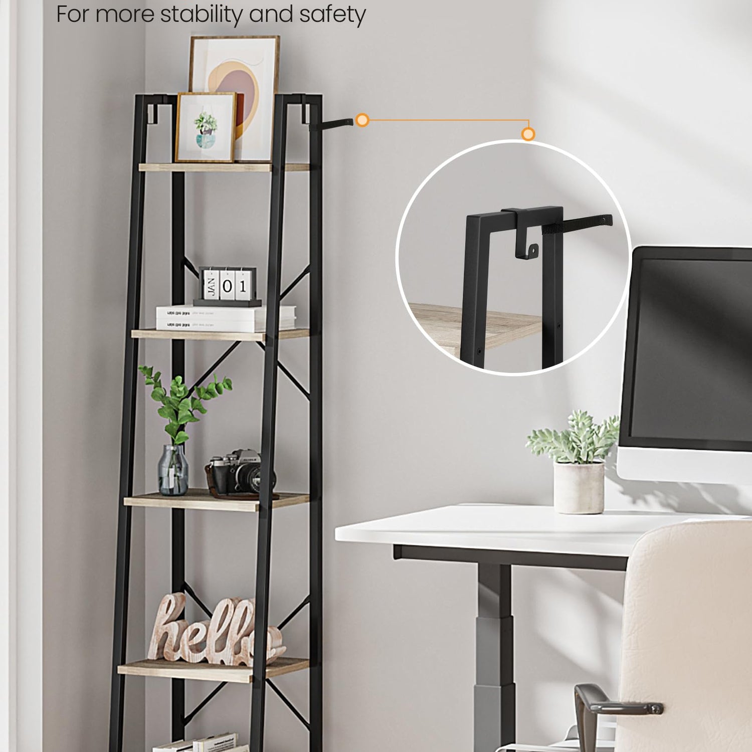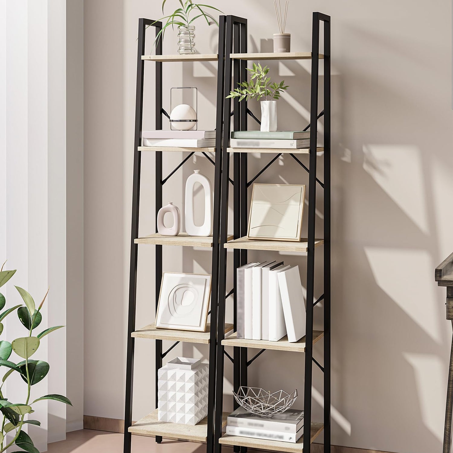 - 【Industrial Design】Combining the greige shelves and ladder design, this ladder shelf gives an eye-catching look and injects charm into your collection display area, all before your treasures show on the stage