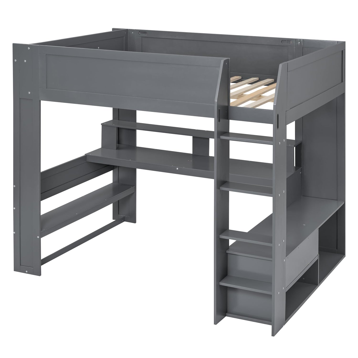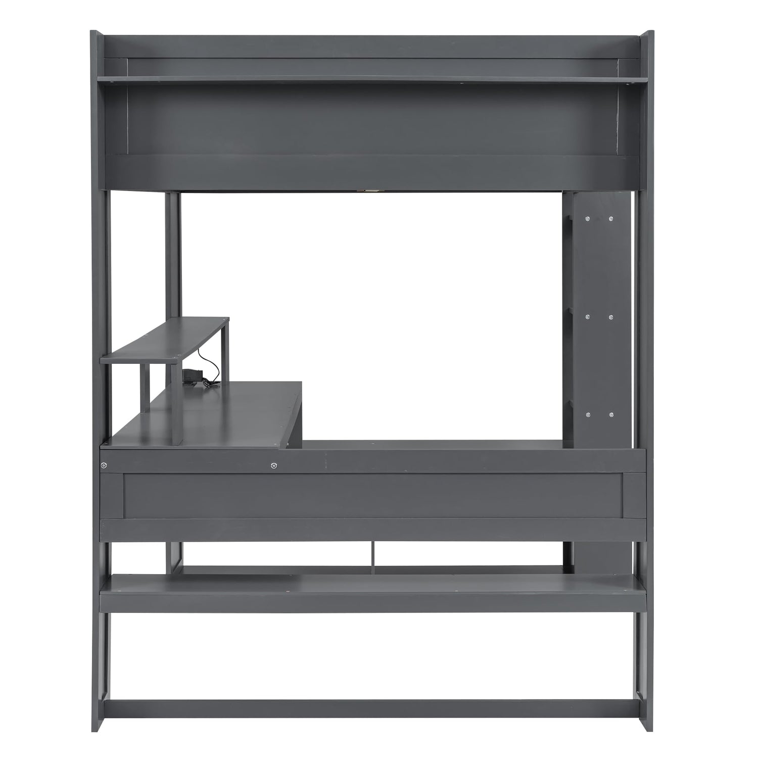 HZXINKEDZSW Full Size Wood Gaming Loft Bed with Desk, Storage Shelves, LED Lights, and Charging Station in Grey