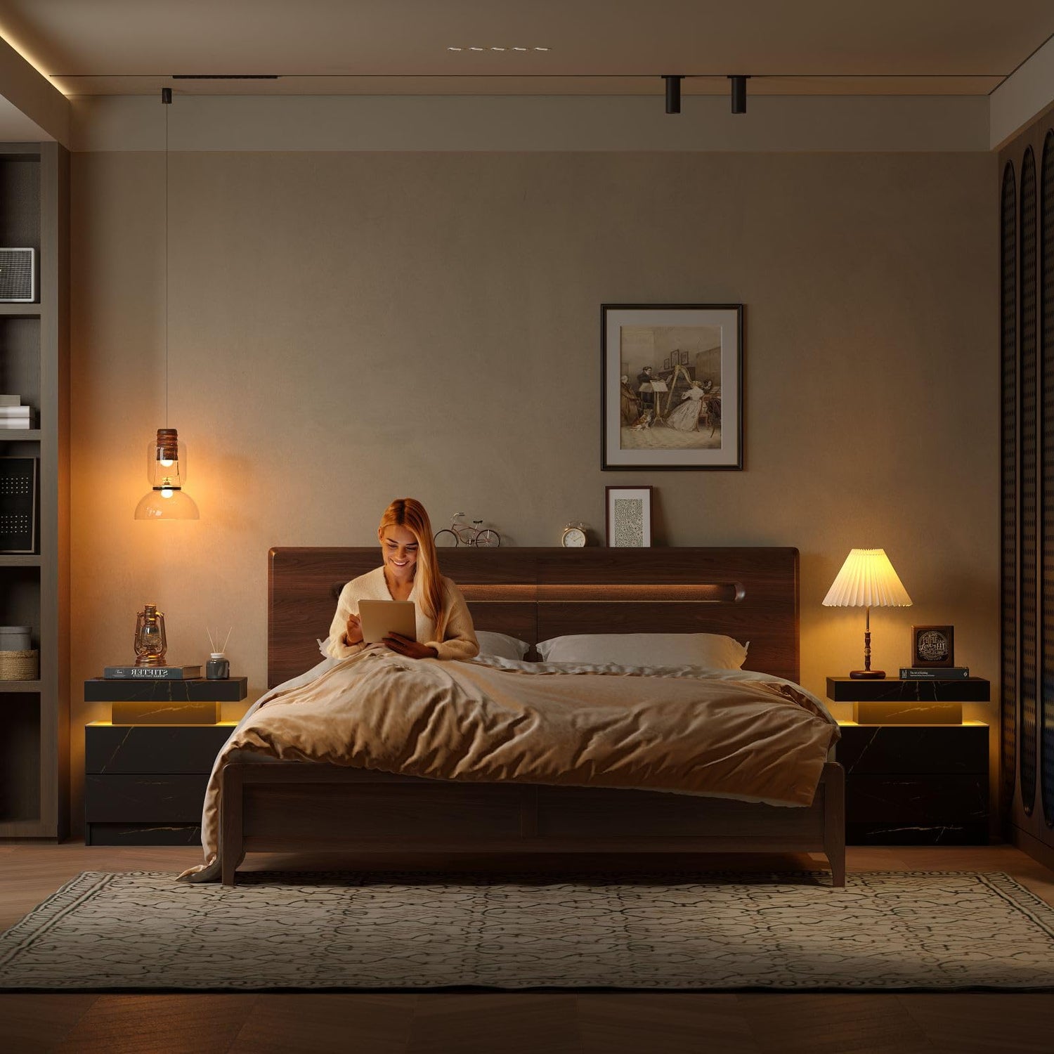 Details: This streamlined nightstand brings a contemporary look to your bedroom while adding ambiance to your bedroom. Crafted from engineered wood, making it easy to charge your phone, tablet, desk lamp, or laptop. It also boasts a smart LED light system that can be controlled by the remote and smartphone app via Bluetooth. We love that its low-profile design is just the right size for smaller spaces. To maintain its appearance, simply wipe clean with a damp cloth.