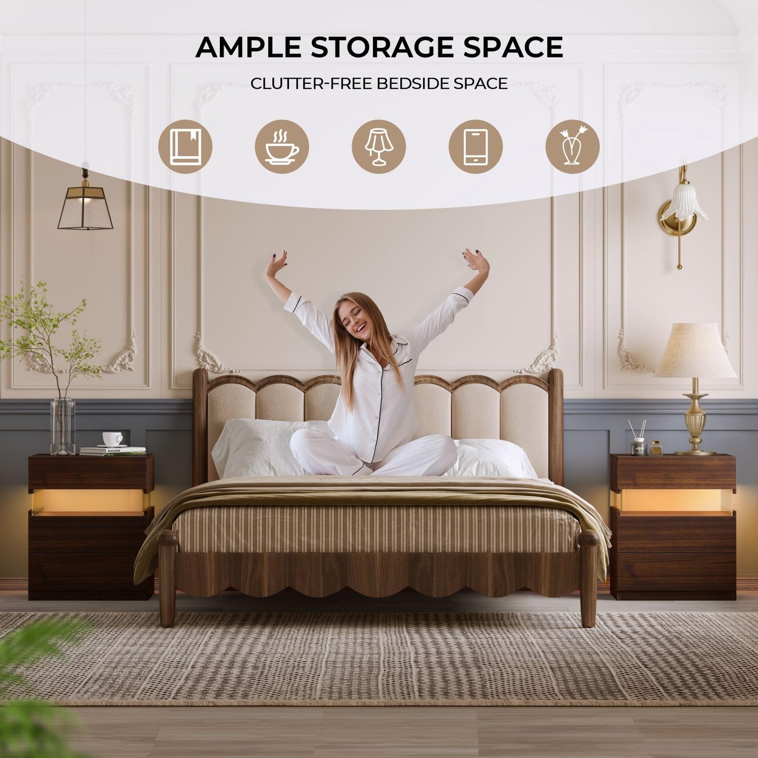 - Spacious Storage: The 3 drawers LED nightstand offer large storage space for nighttime necessities. The wood top is ideal to place alarm clock, phone, charger, eyeglasses, keeping them in your reach. Capacity: 37.26 Lbs.
