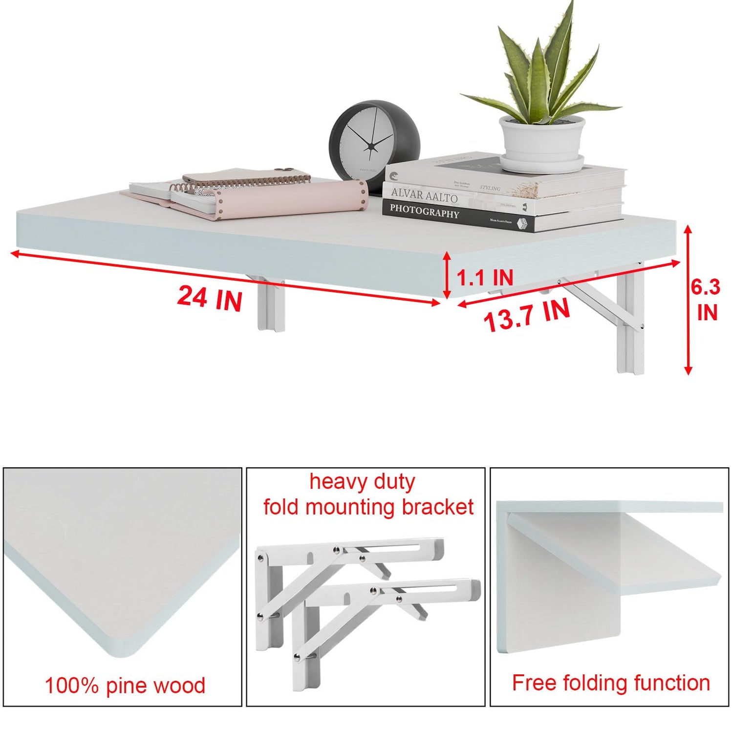 IAE Wall Mounted Folding Table with pine wood, 24" x 14" Wall Mount Drop Leaf Table, Floating Desk with Iron Bracket, Fold Down Desk for Small Spaces, Home Office, Dining, Laundry Room, Kitchen, White