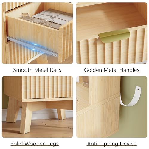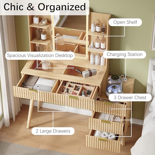 IAISRO 42'' Fluted Makeup Vanity Desk with LED Lights Mirror & Charging Station, Modern Glass Top Vanity Table with 5 Drawers & Open Shelves, Dressing Table for Bedroom, Living Room, Oak