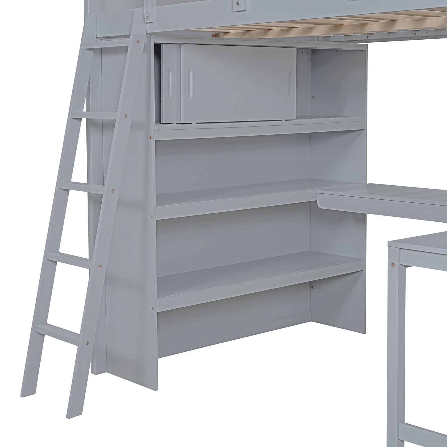 Details: Full Size Loft Bed with Desk and Shelves – Gray