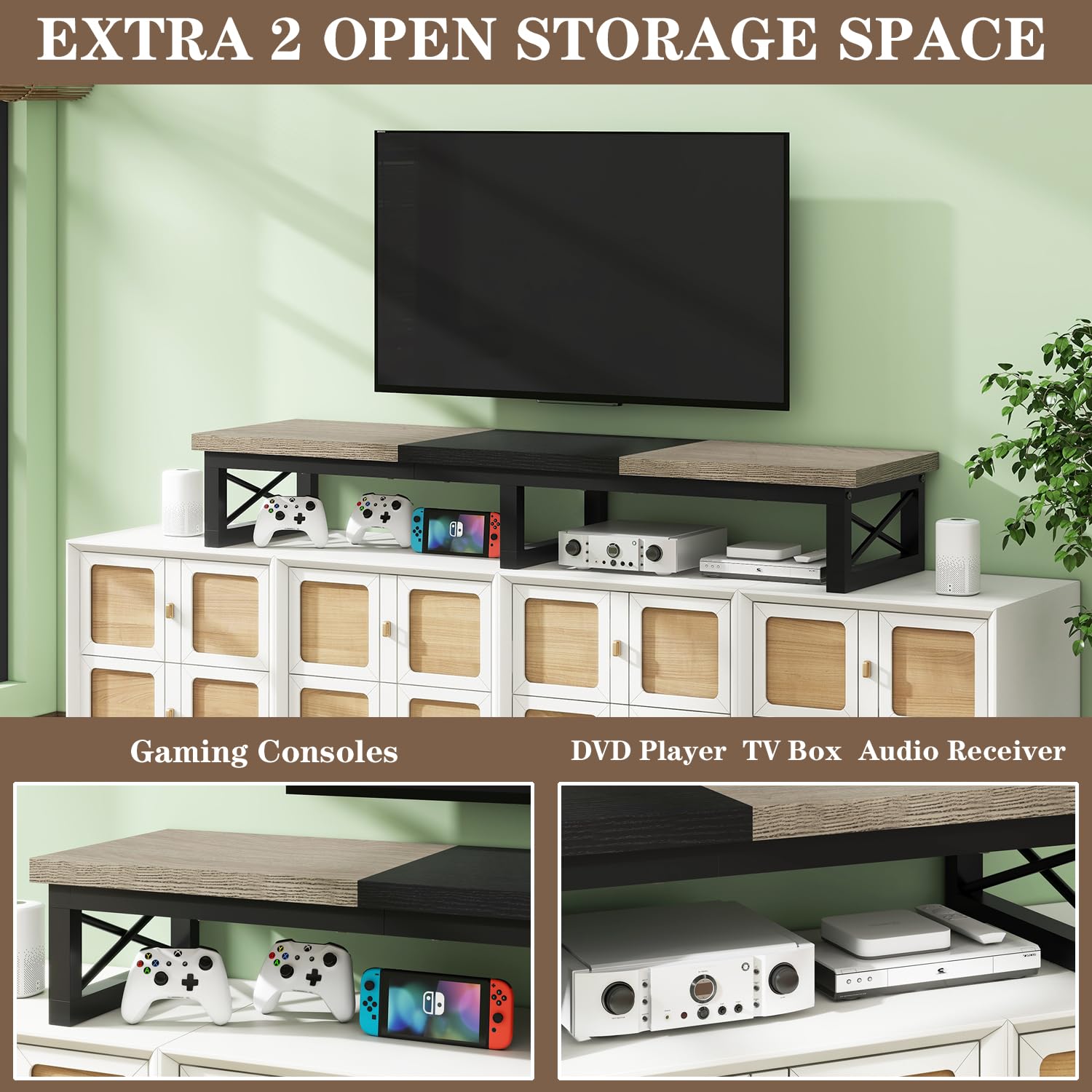 - Ample Storage Space: This tv console has 2 tiers open storage shelves, provides ample space to organize and display your sound bar, controllers and cable tv box, satellite receiver, gaming consoles such as PS4, Xbox. Keep your living room tidy and clutter-free.