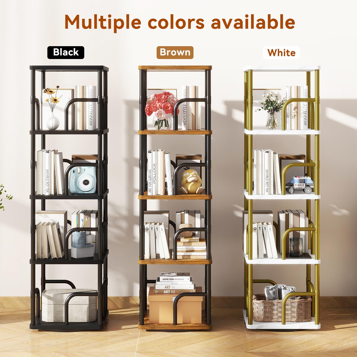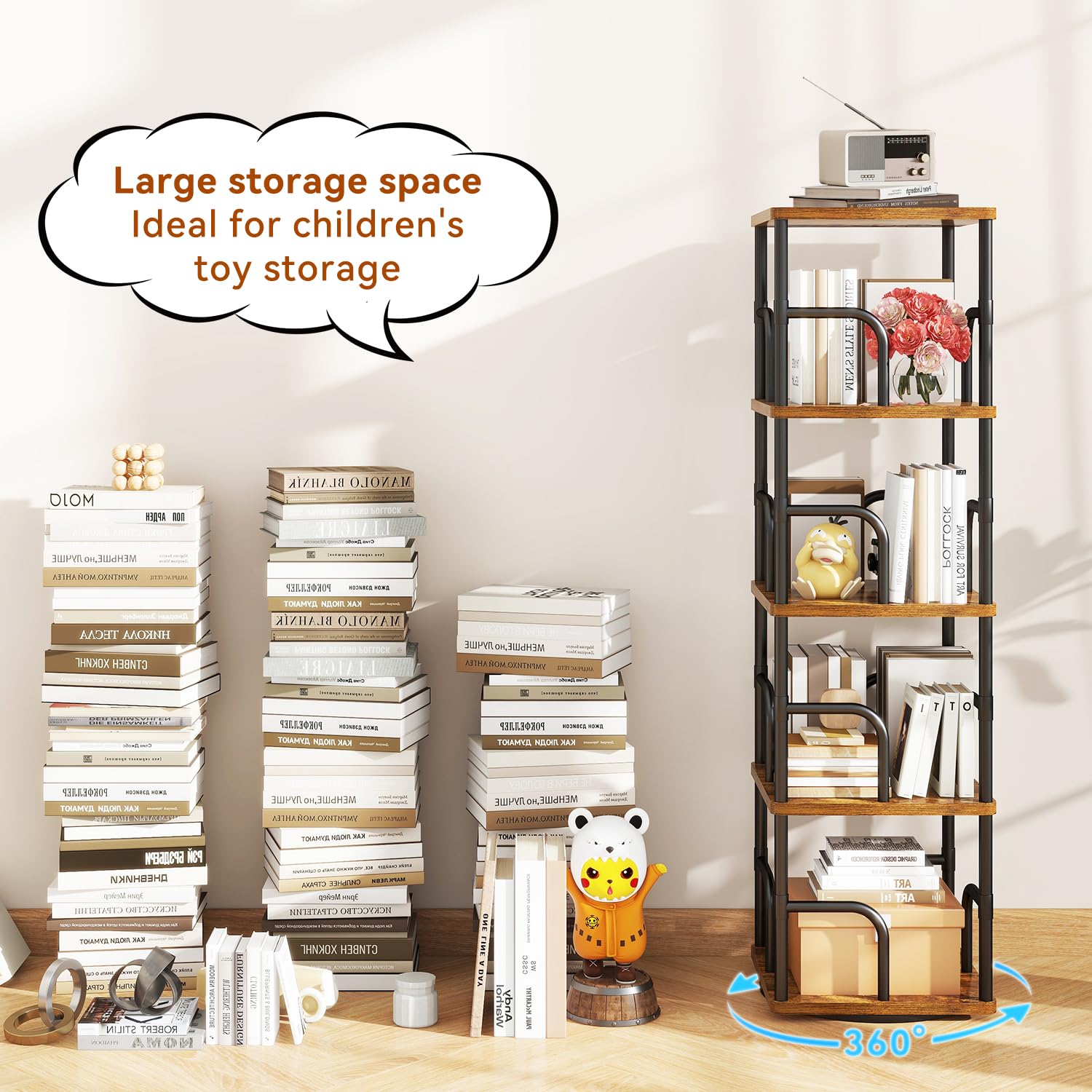 - LARGE CAPACITY: Our rotating bookcase has 5 tiers of shelves and an open top shelf, providing plenty of space for display and storage. The shelves can hold approximately 80-129 medium-sized books, making every room look like a small library.SIZE: 11.8"W x 11.8"D x 47.2"H.