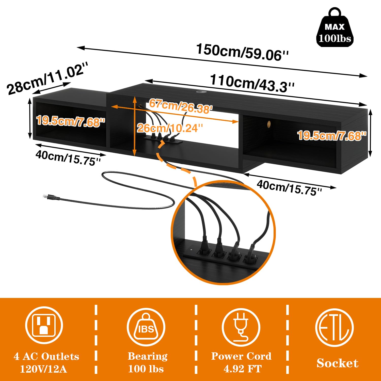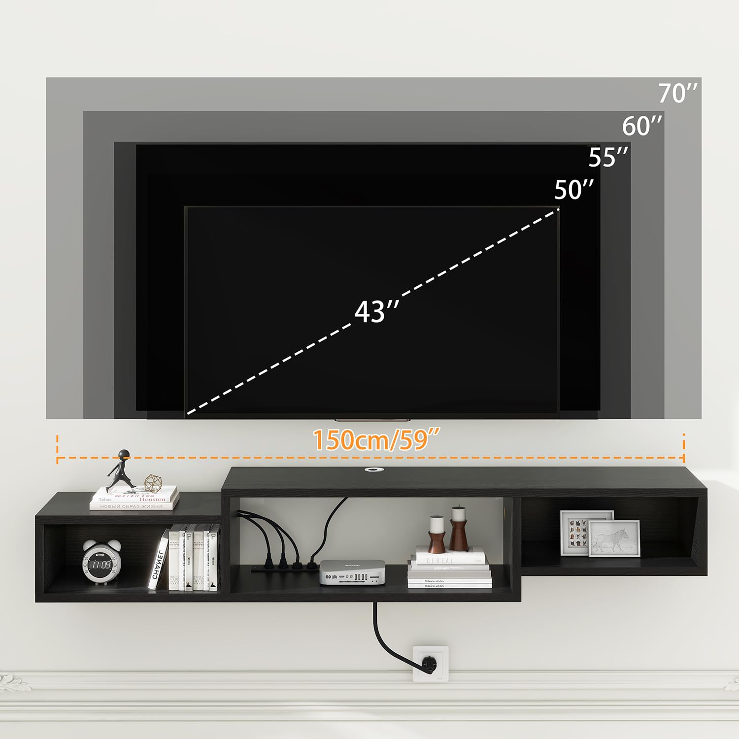 IBUYKE 59" Floating TV Stand Wall Mounted with Power Outlet,Wood Wall Mounted Media Console Shelf,Floating Entertainment Center for Under TV Storage for Living Room Bedroom Office,Black WST007B