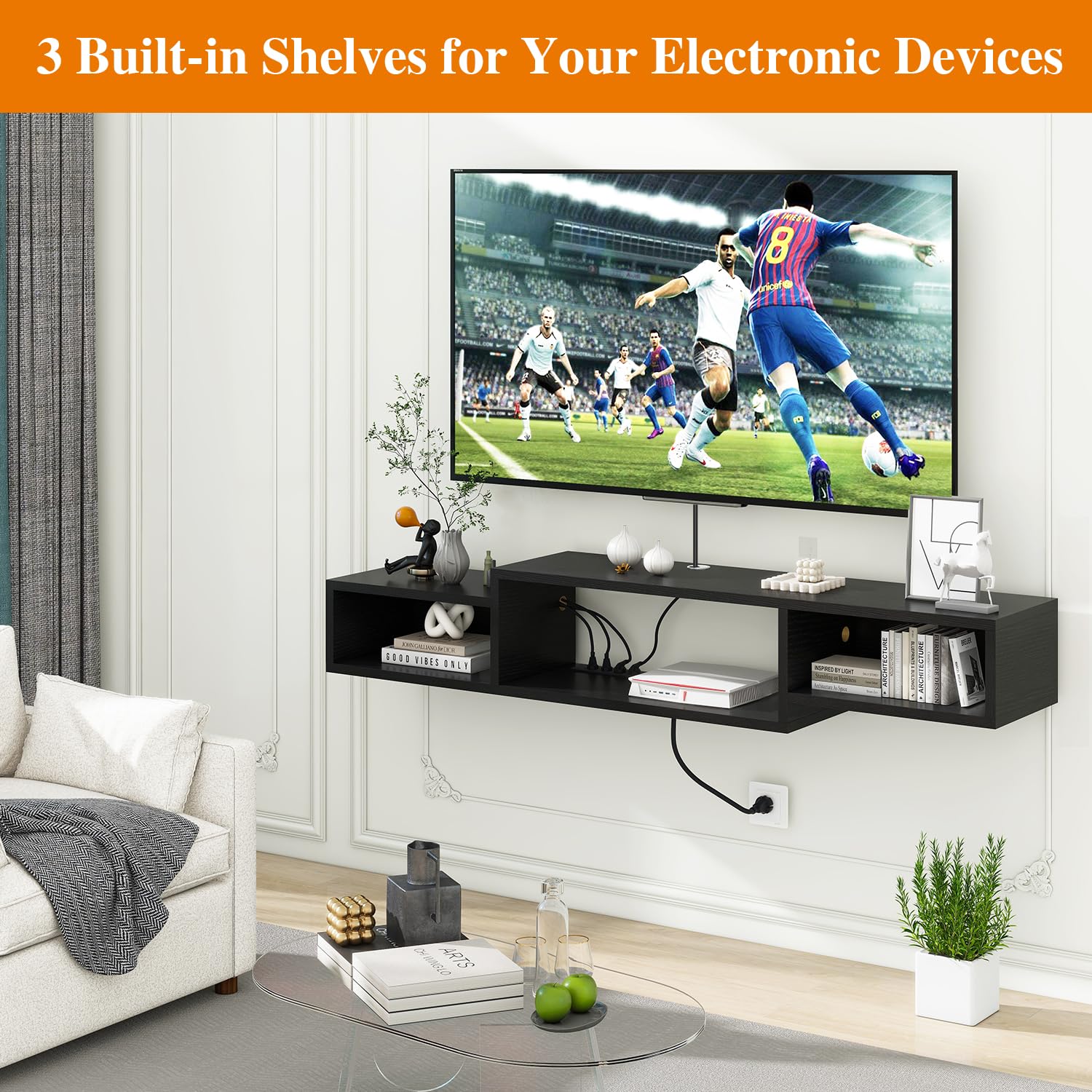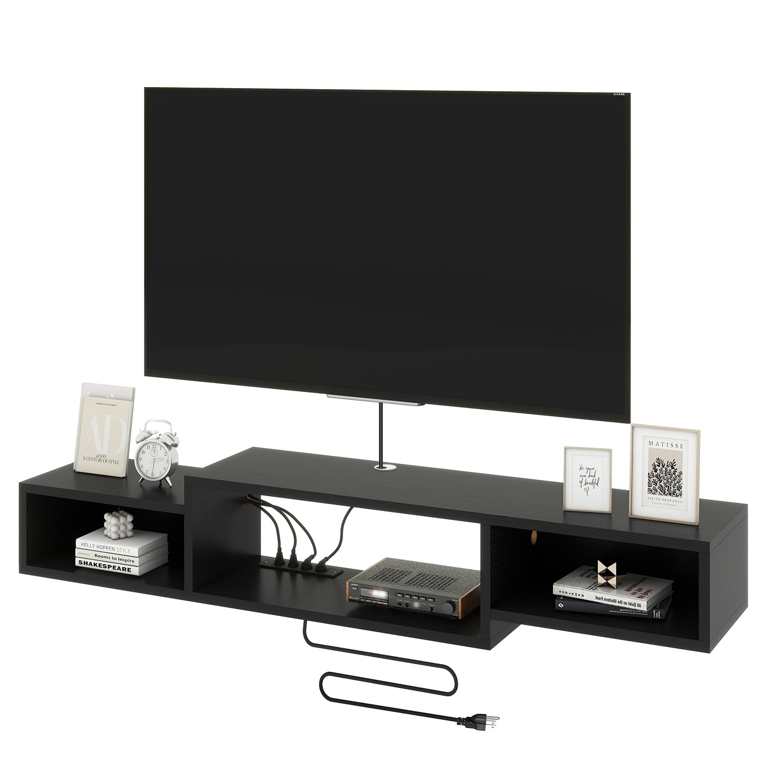 - CABLE MANAGEMENT: Still worrying about messy wires when putting a TV? Our wall mounted TV shelf has the hollowed holes specially designed to hide messy cords inside the stand so that your belongings are organized. floating TV cabinet also come with a recessed power strip, inside features 4 standard plug outlets for which you can charge your TV, DVD, WiFi router and etc.It makes everything look neat!