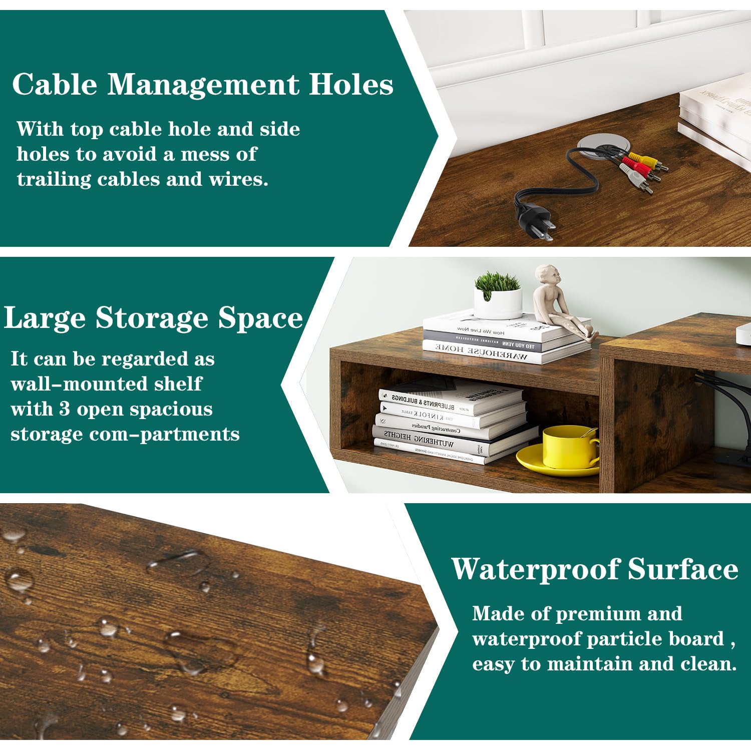 - CABLE MANAGEMENT: Still worrying about messy wires when putting a TV? Our wall mounted TV shelf has the hollowed holes specially designed to hide messy cords inside the stand so that your belongings are organized. floating TV cabinet also come with a recessed power strip, inside features 4 standard plug outlets for which you can charge your TV, DVD, WiFi router and etc.It makes everything look neat!