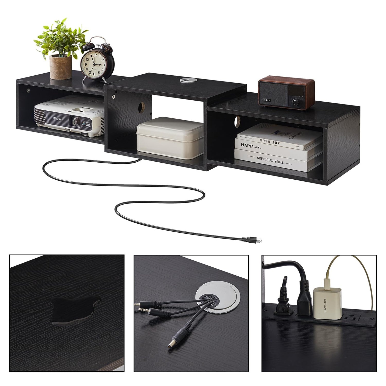 - 【CABLE MANAGEMENT】Still worrying about messy wires when putting a TV? Our wall mounted TV shelf has the hollowed holes specially designed to hide messy cords inside the stand so that your belongings are organized. floating TV cabinet also come with a recessed power strip, inside features 4 standard plug outlets for which you can charge your TV, DVD, WiFi router and etc.It makes everything look neat!