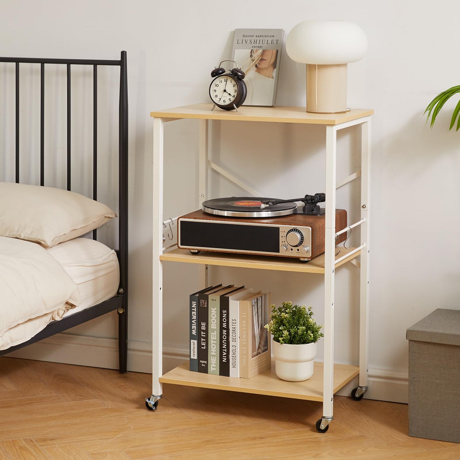 IBUYKE Kitchen Shelf Cart, 3-Tier Microwave Oven Stand, Baker’s Rack with Metal Frame and 8 Hooks, Industrial Printer Stand, Utility Standing Storage Shelf for Coffee Bar, Simple Assembly, TMJ023R