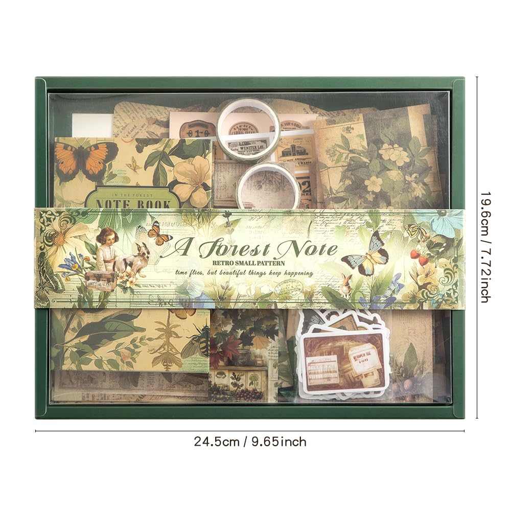 - 【green Forest Scrapbooking Paper Kit】The scrapbooking supplies kit includes: 20 sheets of material paper (29*125mm), 14 sheets of background paper (136*140mm/177*228mm), 2 envelopes (131*94mm), 4 sheets of letter paper in 4 styles (125*177mm), 10 sheets of lace material paper (120*80mm), 10 photo frame cards (60*84mm), 30 sticky notes in 3 sizes (70/50mm/70*70mm/70*125mm), 10 hanging tags (40*60mm), and 4 stamps (125*87mm).