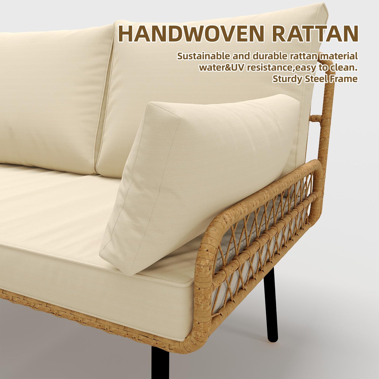 - All-Weather Durability: Crafted with a sturdy steel frame and premium PE rattan, this wicker patio conversation set withstands the elements. The all-weather polyester fabric ensures lasting beauty, perfect for year-round porch or outside furniture