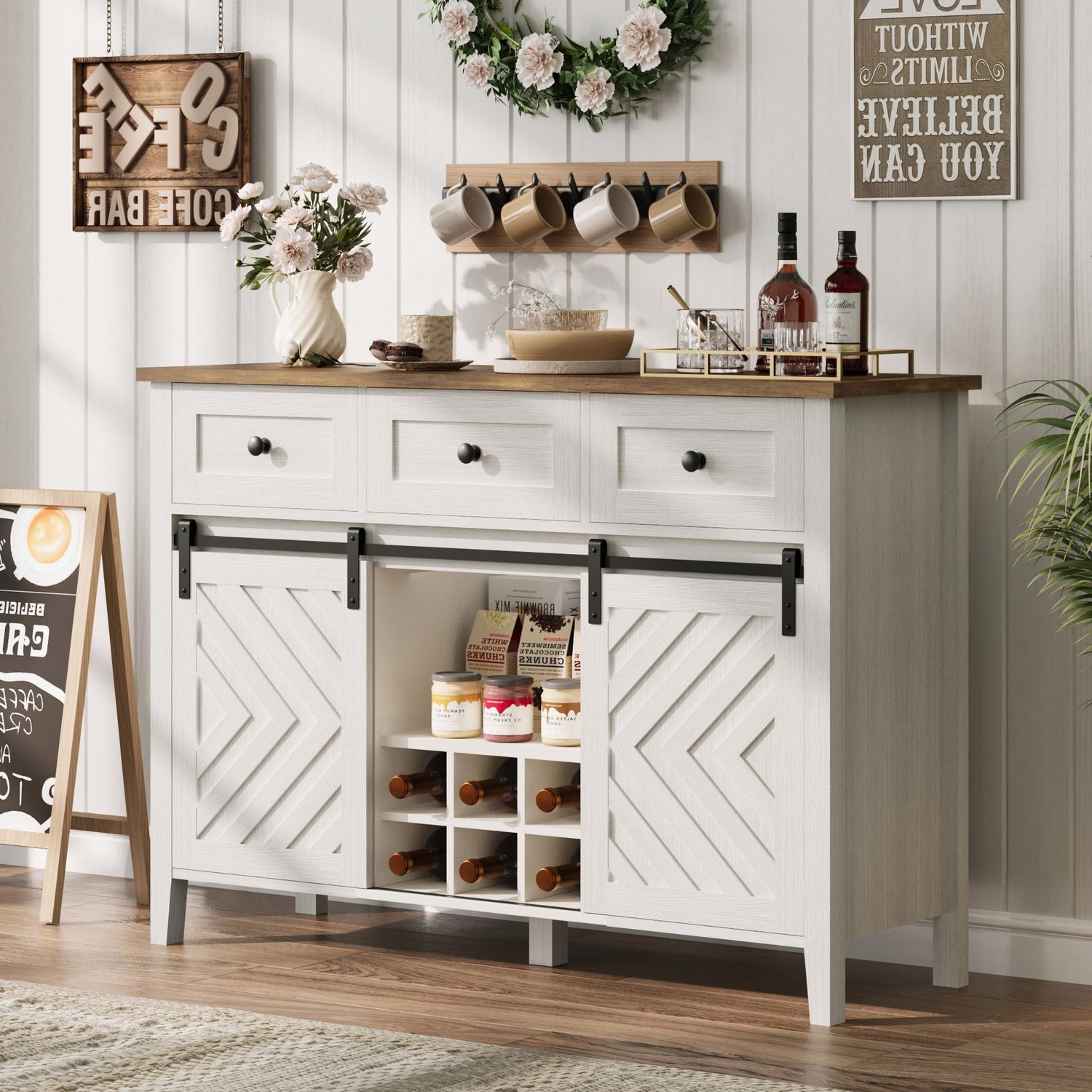 IDEALHOUSE 47.2'' Farmhouse Buffet Cabinet with Sliding Barn Door, 33.4'' Tall Wood Rustic Sideboard with 3 Drawer, Adjustable Shelf and Removable Wine Rack for Dining Room, Kitchen, White