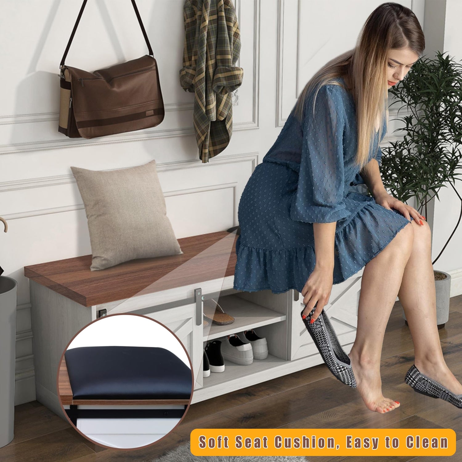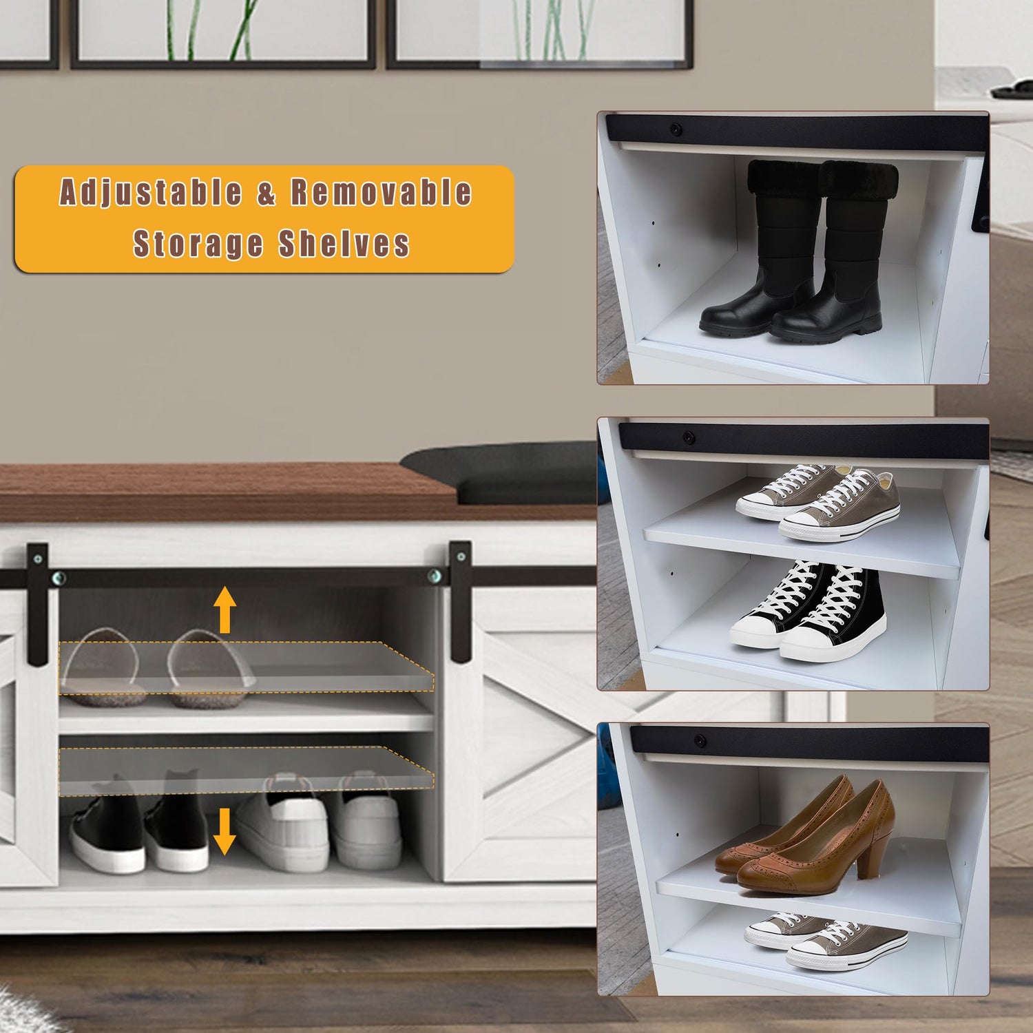 IDEALHOUSE 47'' Farmhouse Shoe Storage Bench with Padded Seat Cushion, End of Bed Entryway Bench with 2 Barn Doors, Adjustable Shelf for Entryway, Living Room, Bedroom White