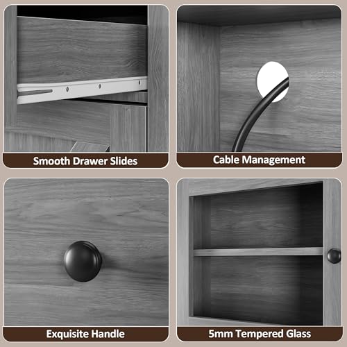- 【Spacious Storage】This 63-inch tall kitchen cabinet features a sleek and modern design. The upper cabinet includes two shelves for storing tableware or cooking utensils, while its tempered glass doors offer a clear view of your stored items. The spacious countertop comes with pre-cut cable holes, creating an ideal station for microwaves, coffee makers, or air fryers.