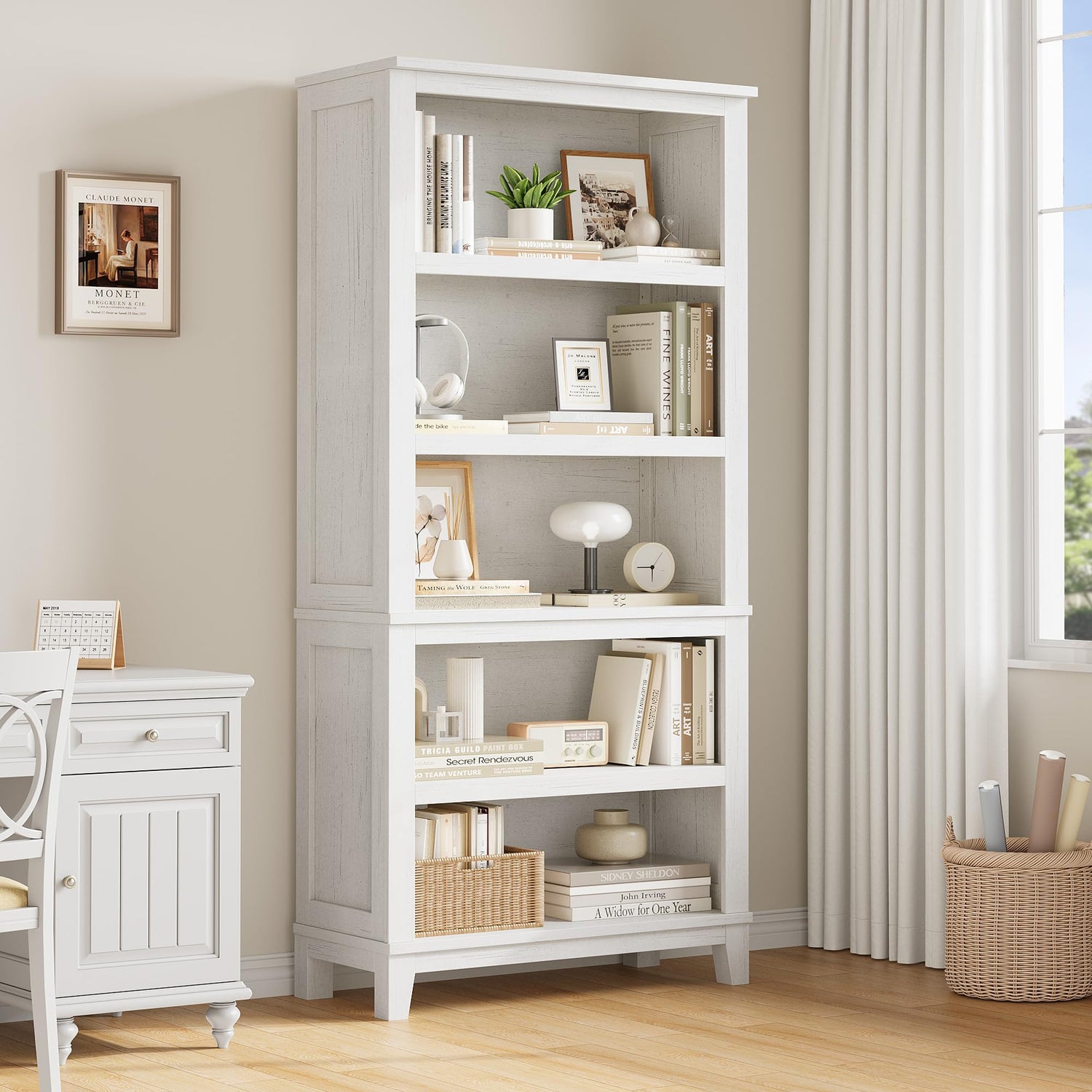 IDEALHOUSE 71" Farmhouse Bookshelf w/Adjustable Shelves & 31.5 in Whidth, 5 Tier Tall Bookshelf with Wooden Legs, Vintage Wooedn Book Shelf for Living Room Office (White, 71.3" H x 31.5" W x 11.8" D)