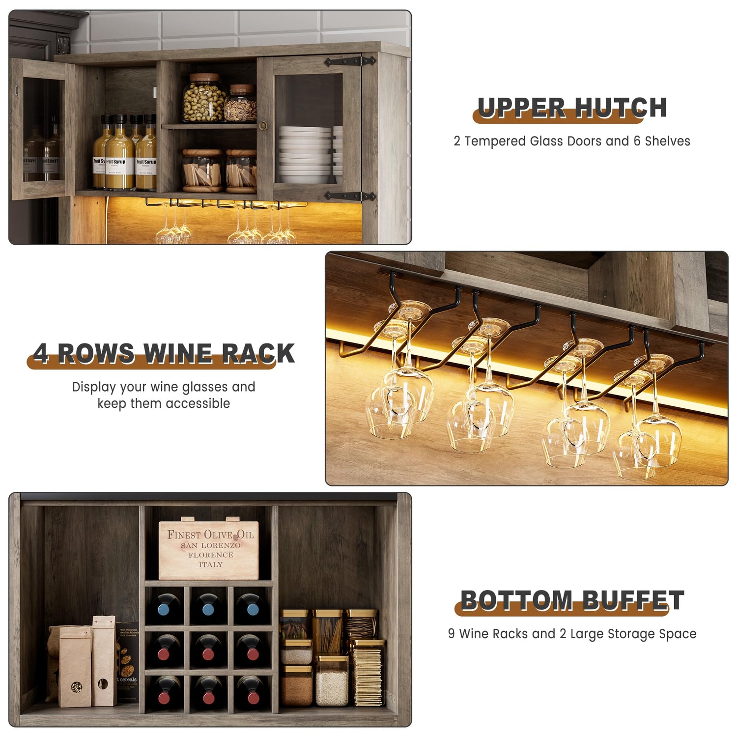 - 【Multifunctional RGB LED Lighting】This coffee bar cabinet features built-in smart RGB LED light strips, controllable via an app. With multiple colors, lighting effects, and smart modes, it creates the perfect ambiance for family gatherings or parties, adding warmth and fun to any occasion.