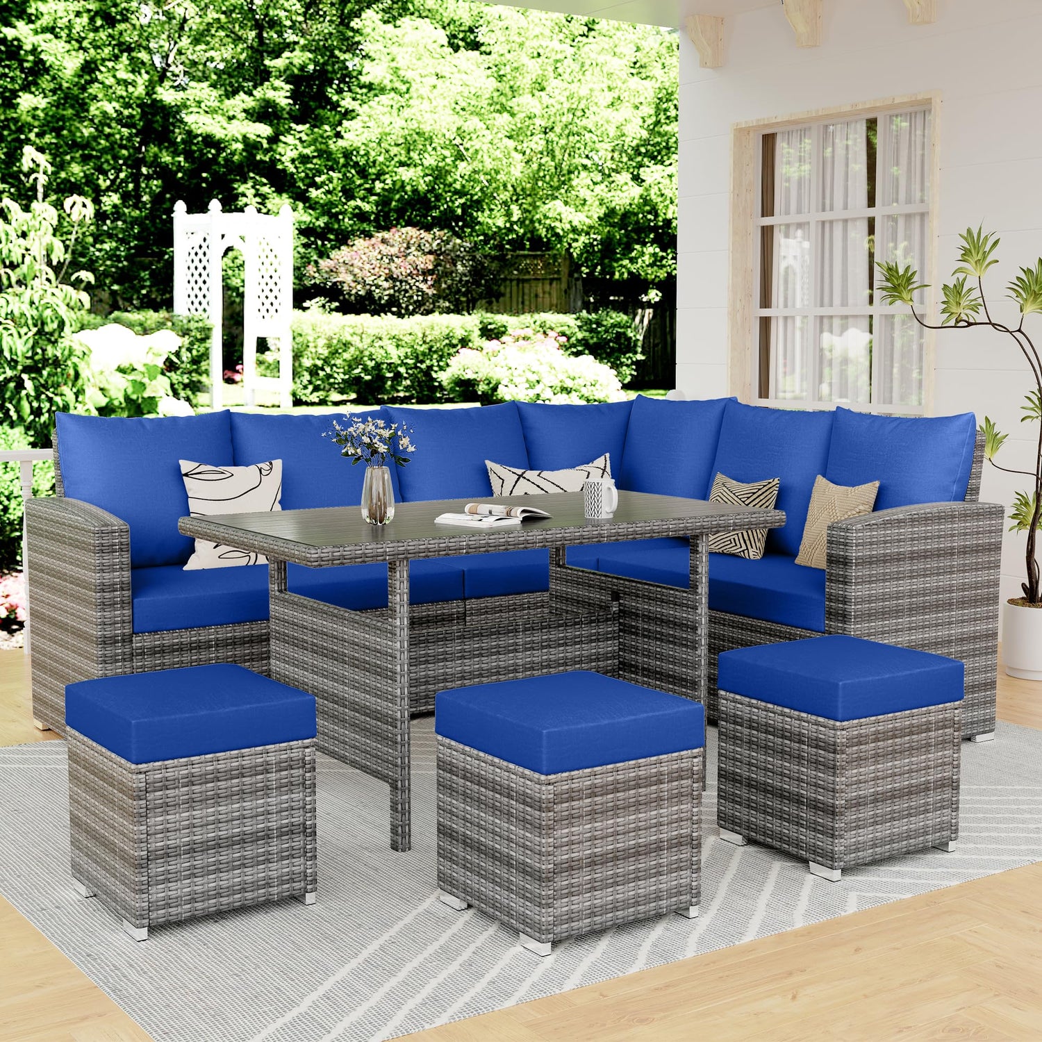 - [Packing Included] Our IDEALHOUSE wicker outdoor dining set comes with 3 corner sofas, 1 patio table, 3 ottomans, 13 cushions, 1 manual, and necessary hardware. It comes in a total of 3 packages.