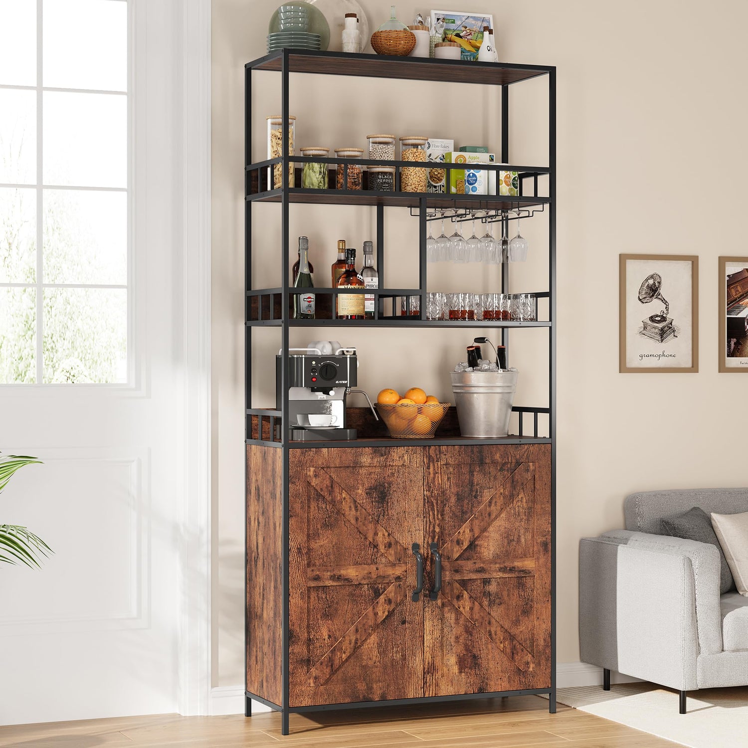 With ample storage space, the 5-tier design showcases a variety of open shelves that make your wine sets easily accessible. A smaller open shelf offers a dedicated spot for bottles and cans, while the included glass holder provides extra room for your goblets. For those looking for additional storage solutions, the large cabinet keeps your food, dishes, or wine bottles dust-free and protected.