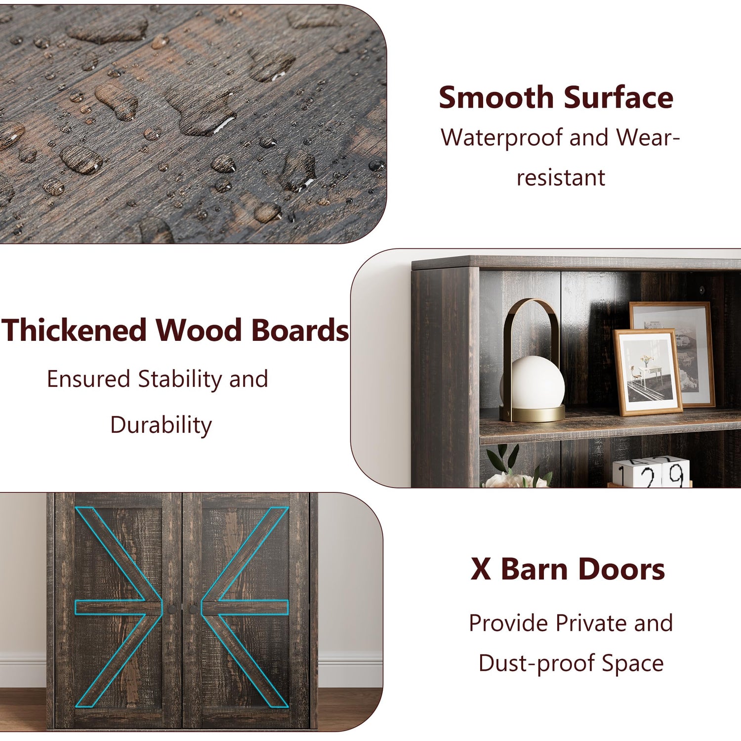 - Stylish Farmhouse Design: This tall bookshelf features wood grain surfaces with X barn doors to add a touch of rustic charm for a farmhouse look and feel, stylish in its appearance, impressive in its simple elegance, and paired with handles for convenient use, showing its high level of craftsmanship and allowing it to easily complement your homes and office decor.