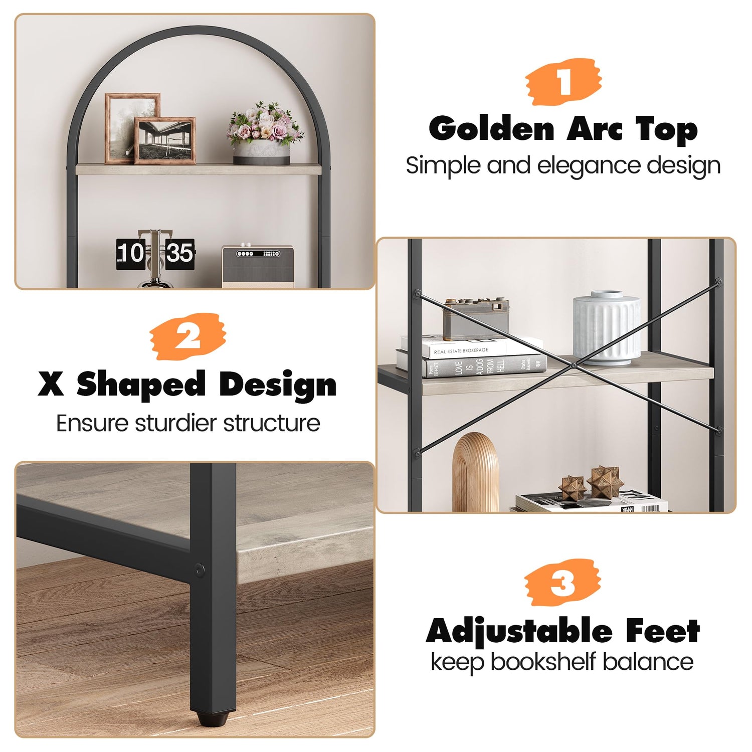 IDEALHOUSE Bookshelf 5 Tier Bookcase Arched Display Racks Tall Standing Bookshelves Metal Frame Modern Storage Rack Shelf Large Wood Book Shelf for Bedroom, Living Room, Home Office
