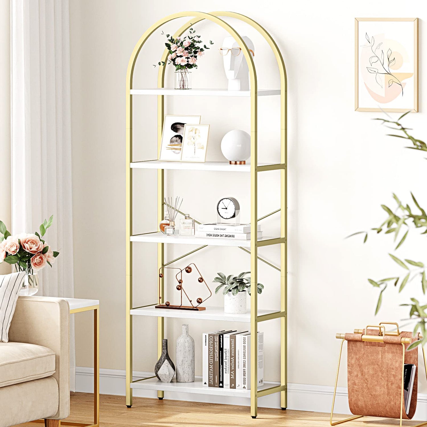 IDEALHOUSE Bookshelf 5 Tier Bookcase Arched Display Racks Tall Standing Bookshelves Metal Frame Modern Storage Rack Shelf Large Wood Book Shelf for Bedroom, Living Room, Home Office, White/Gold